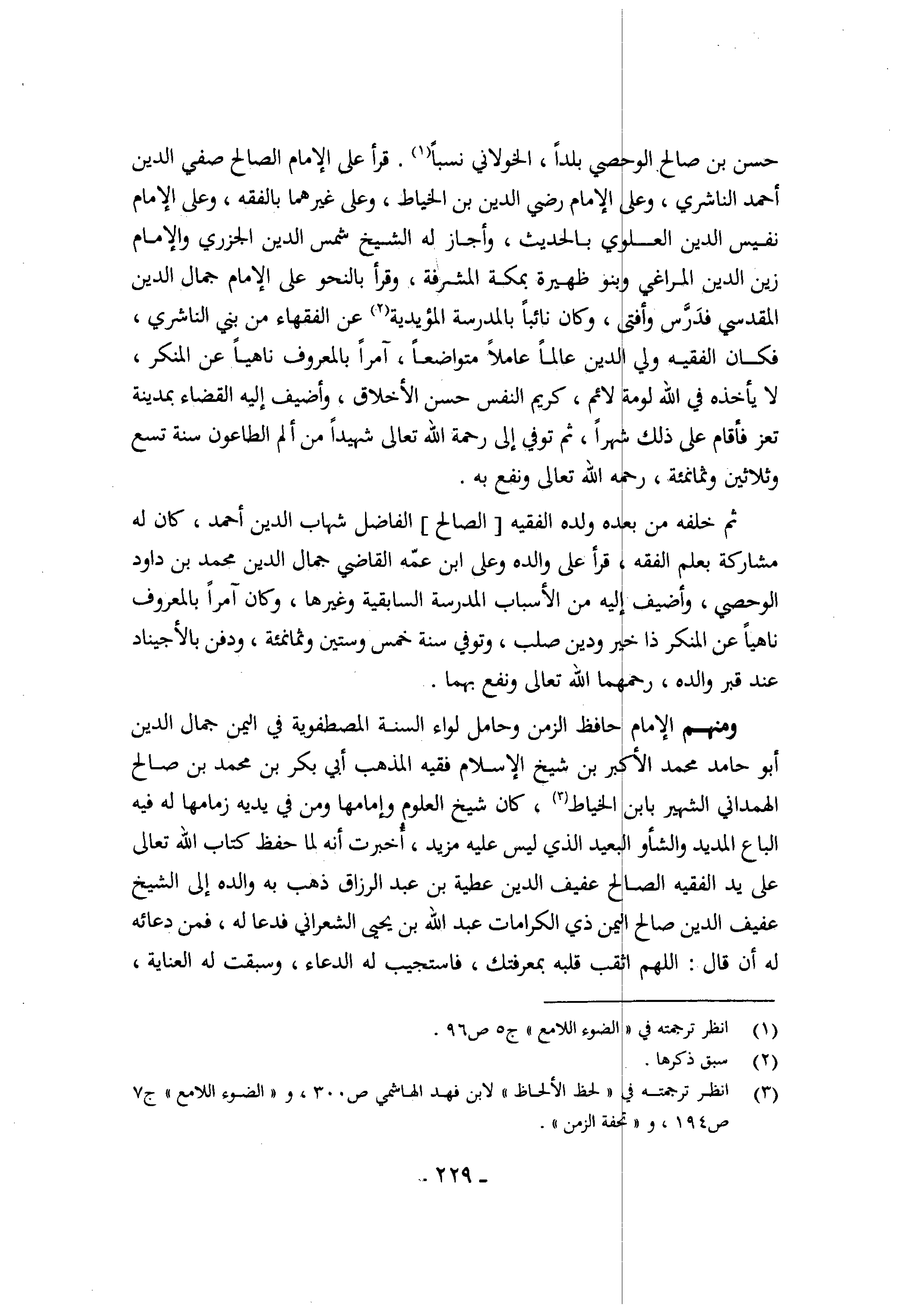 حسن بن صَالح الوحصي بَلَدا الْخَولَانِيّ نسبا قَرَأَ على الإِمَام الصَّالح صفي الدّين أَحْمد النَّاشِرِيّ وعَلى الإِمَام رَضِي الدّين بن الْخياط وعَلى غَيرهمَا بالفقه وعَلى الإِمَام نَفِيس الدّين الْعلوِي بِالْحَدِيثِ وَأَجَازَ لَهُ الشَّيْخ شمس الدّين الْجَزرِي وَالْإِمَام زين الدّين المراغي وَبَنُو ظهيرة بِمَكَّة المشرفة وَقَرَأَ بالنحو على الإِمَام جمال الدّين الْمَقْدِسِي فدرس وَأفْتى وَكَانَ نَائِبا بِالْمَدْرَسَةِ المؤيدية عَن الْفُقَهَاء من بني النَّاشِرِيّ فَكَانَ الْفَقِيه ولي الدّين عَالما عَاملا متواضعا آمرا بِالْمَعْرُوفِ ناهيا عَن الْمُنكر لَا يَأْخُذهُ فِي الله لومة لائم كريم النَّفس حسن الْأَخْلَاق وأضيف إِلَيْهِ الْقَضَاء بِمَدِينَة تعز فَأَقَامَ على ذَلِك شهرا ثمَّ توفّي إِلَى رَحْمَة الله تَعَالَى شَهِيدا من ألم الطَّاعُون سنة تسع وَثَلَاثِينَ وثمانمئة رَحمَه الله تَعَالَى ونفع بِهِ