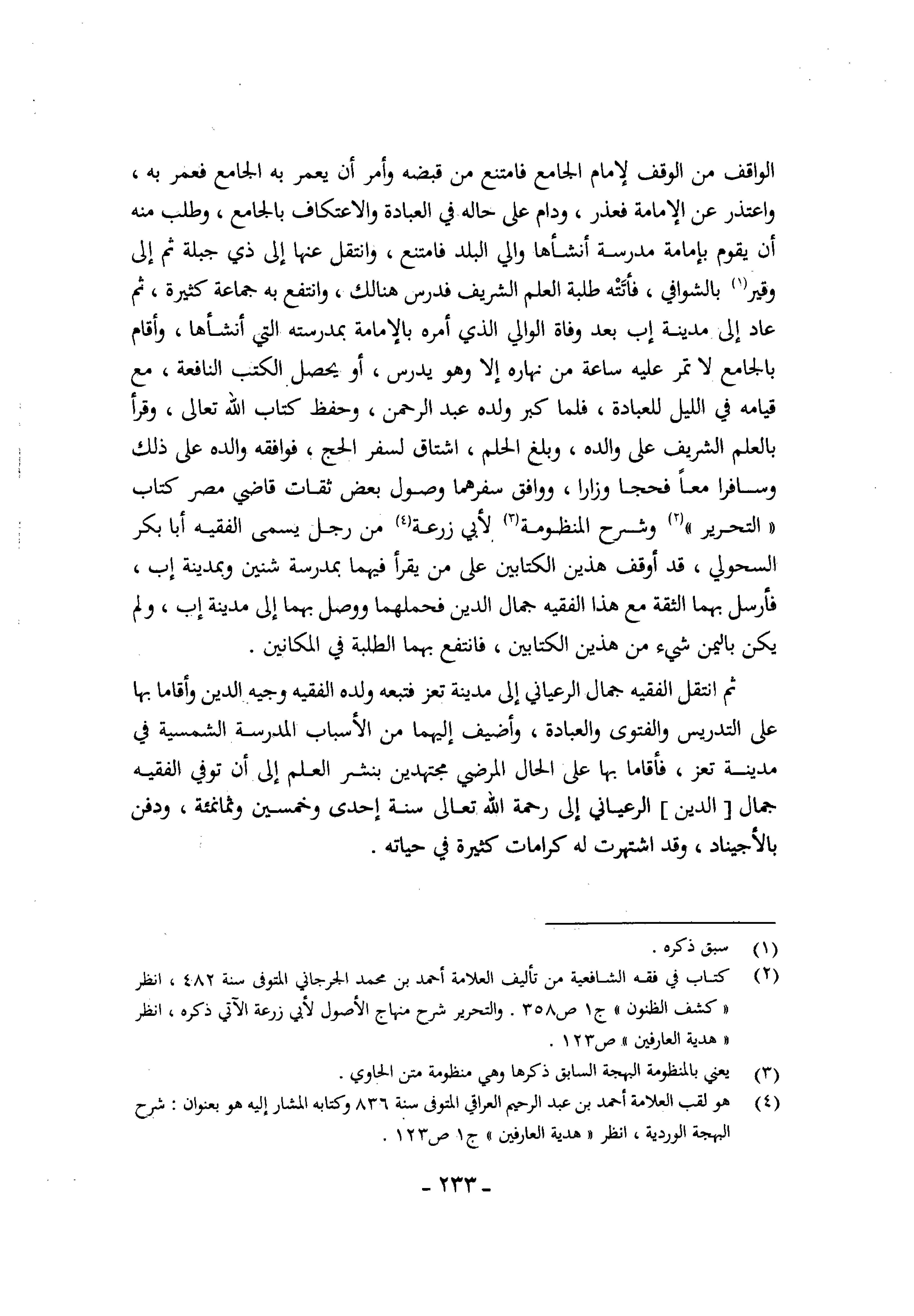 الْوَاقِف من الْوَقْف لإِمَام الْجَامِع فَامْتنعَ من قَبضه وَأمر أَن يعمر بِهِ الْجَامِع فعمر بِهِ وَاعْتذر عَن الْإِمَامَة فعذر ودام على حَاله فِي الْعِبَادَة وَالِاعْتِكَاف بالجامع وَطلب مِنْهُ أَن يقوم بإمامة مدرسة أَنْشَأَهَا وَالِي الْبَلَد فَامْتنعَ وانتقل عَنْهَا إِلَى ذِي جبلة ثمَّ إِلَى وقير بالشوافي فَأَتَتْهُ طلبة الْعلم الشريف فدرس هُنَالك وانتفع بِهِ جمَاعَة كَثِيرَة ثمَّ عَاد إِلَى مَدِينَة إب بعد وَفَاة الْوَالِي الَّذِي أمره بِالْإِمَامَةِ بمدرسته الَّتِي أَنْشَأَهَا وَأقَام بالجامع لَا تمر عَلَيْهِ سَاعَة من نَهَاره إِلَّا وَهُوَ يدرس أَو يحصل الْكتب النافعة مَعَ قِيَامه فِي اللَّيْل لِلْعِبَادَةِ فَلَمَّا كبر وَلَده عبد الرَّحْمَن وَحفظ كتاب الله تَعَالَى وَقَرَأَ بِالْعلمِ الشريف على وَالِده وَبلغ الْحلم اشتاق لسفر الْحَج فوافقه وَالِده على ذَلِك وسافرا مَعًا فحجا وزارا وَوَافَقَ سفرهما وُصُول بعض ثِقَات قَاضِي مصر كتاب التَّحْرِير وَشرح الْمَنْظُومَة لأبي زرْعَة من رجل يُسمى الْفَقِيه أَبَا بكر السحولي قد أوقف هذَيْن الْكِتَابَيْنِ على من يقْرَأ فيهمَا بمدرسة شنين وبمدينة إب فَأرْسل بهما الثِّقَة مَعَ هَذَا الْفَقِيه جمال الدّين فحملهما وَوصل بهما إِلَى مَدِينَة إب وَلم يكن بِالْيمن شَيْء من هذَيْن الْكِتَابَيْنِ فَانْتَفع بهما الطّلبَة فِي المكانين