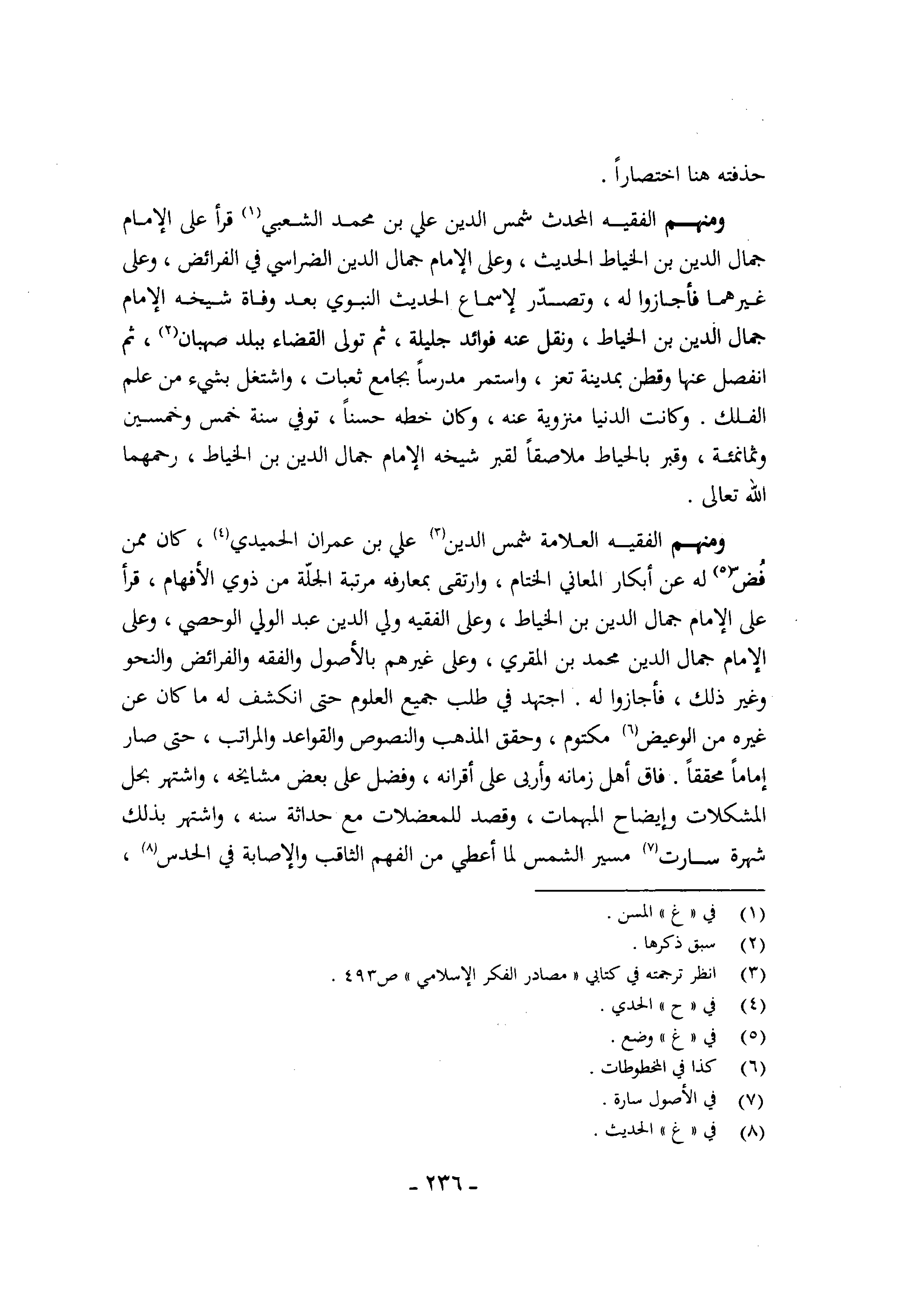 وَمِنْهُم الْفَقِيه الْعَلامَة شمس الدّين عَليّ بن عمرَان الْحميدِي كَانَ مِمَّن فض لَهُ عَن أبكار الْمعَانِي الختام وارتقى بمعارفه مرتبَة الجلة من ذَوي الأفهام قَرَأَ على الإِمَام جمال الدّين بن الْخياط وعَلى الْفَقِيه ولي الدّين عبد الْوَلِيّ الوحصي وعَلى الإِمَام جمال الدّين مُحَمَّد بن الْمقري وعَلى غَيرهم بالأصول وَالْفِقْه والفرائض والنحو وَغير ذَلِك فأجازوا لَهُ اجْتهد فِي طلب جَمِيع الْعُلُوم حَتَّى انْكَشَفَ لَهُ مَا كَانَ عَن غَيره من الوعيض مَكْتُوم وحقق الْمَذْهَب والنصوص وَالْقَوَاعِد والمراتب حَتَّى صَار إِمَامًا محققا فاق أهل زَمَانه وأربى على أقرانه وَفضل على بعض مشايخه واشتهر بِحل المشكلات وإيضاح المبهمات وَقصد للمعضلات مَعَ حَدَاثَة سنه واشتهر بذلك شهرة سَارَتْ مسير الشَّمْس لما أعطي من الْفَهم الثاقب والإصابة فِي الحدس