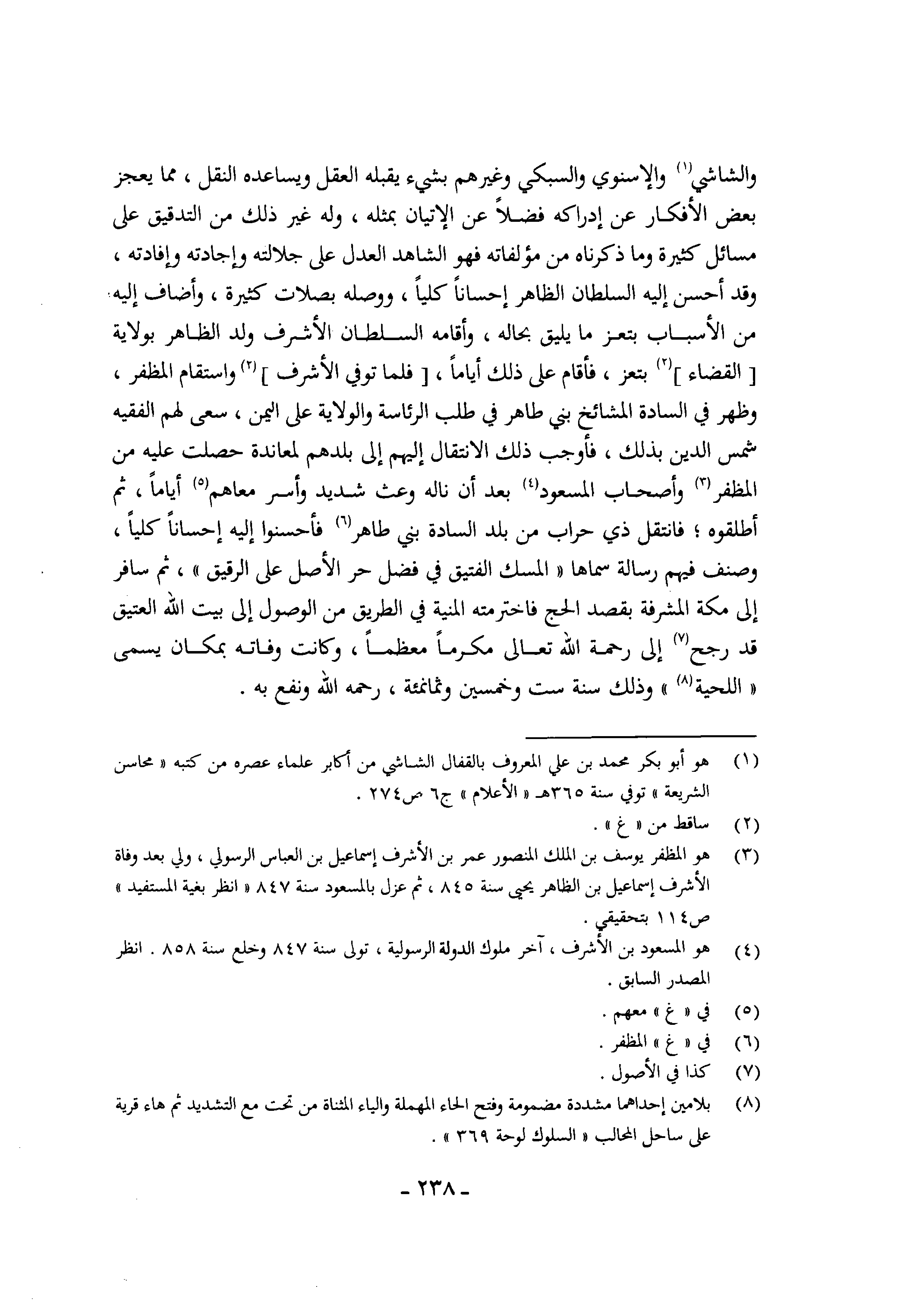والشاشي والإسنوي والسبكي وَغَيرهم بِشَيْء يقبله الْعقل ويساعده النَّقْل مِمَّا يعجز بعض الإفكار عَن إِدْرَاكه فضلا عَن الْإِتْيَان بِمثلِهِ وَله غير ذَلِك من التدقيق على مسَائِل كَثِيرَة وَمَا ذَكرْنَاهُ من مؤلفاته فَهُوَ الشَّاهِد الْعدْل على جلالته وأجادته وإفادته وَقد أحسن إِلَيْهِ السُّلْطَان الظَّاهِر إحسانا كليا وَوَصله بصلات كَثِيرَة وأضاف إِلَيْهِ من الْأَسْبَاب بتعز مَا يَلِيق بِحَالهِ وأقامه السُّلْطَان الْأَشْرَف ولد الظَّاهِر بِولَايَة الْقَضَاء بتعز فَأَقَامَ على ذَلِك أَيَّامًا فَلَمَّا توفّي الْأَشْرَف واستقام المظفر وَظهر فِي السَّادة المشائخ بني طَاهِر فِي طلب الرِّئَاسَة وَالْولَايَة على الْيمن سعى لَهُم الْفَقِيه شمس الدّين بذلك فَأوجب ذَلِك الِانْتِقَال إِلَيْهِم إِلَى بلدهم لمعاندة حصلت عَلَيْهِ من المظفر وَأَصْحَاب المسعود بعد أَن ناله وعث شَدِيد وَأسر معاهم أَيَّامًا ثمَّ أَطْلقُوهُ فانتقل ذِي حراب من بلد السَّادة بني طَاهِر فَأحْسنُوا إِلَيْهِ إحسانا كليا وصنف فيهم رِسَالَة سَمَّاهَا الْمسك الفتيق فِي فضل حر الأَصْل على الرَّقِيق ثمَّ سَافر إِلَى مَكَّة المشرفة بِقصد الْحَج فاخترمته الْمنية فِي الطَّرِيق من الْوُصُول إِلَى بَيت الله الْعَتِيق قد رجح إِلَى رَحْمَة الله تَعَالَى مكرما مُعظما وَكَانَت وَفَاته بمَكَان يُسمى اللِّحْيَة وَذَلِكَ سنة سِتّ وَخمسين وثمانمئة رَحمَه الله ونفع بِهِ