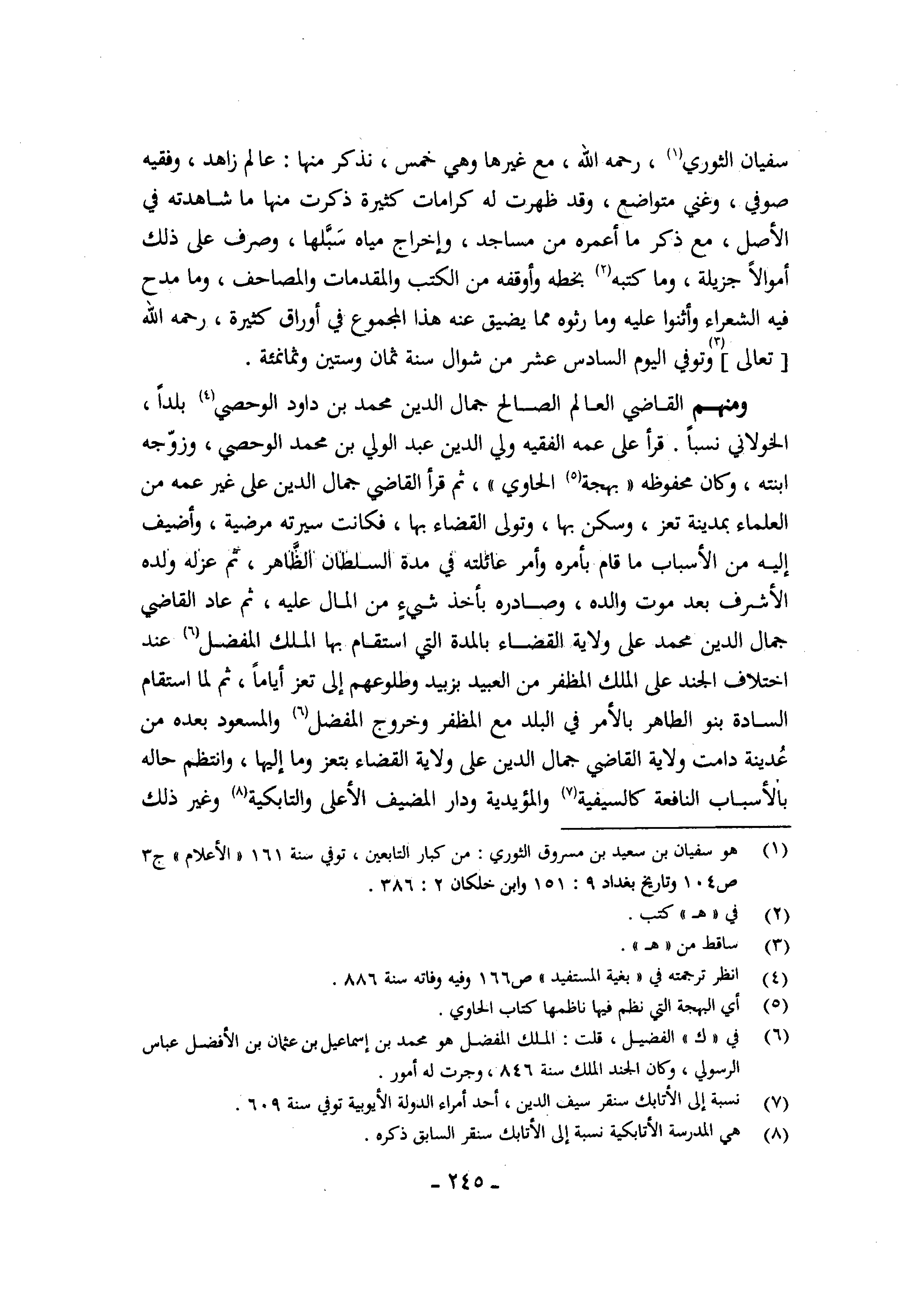 سُفْيَان الثَّوْريّ رَحمَه الله مَعَ غَيرهَا وَهِي خمس نذْكر مِنْهَا عَالم زاهد وفقيه صوفي وغني متواضع وَقد ظَهرت لَهُ كرامات كَثِيرَة ذكرت مِنْهَا مَا شاهدته فِي الأَصْل مَعَ ذكر مَا أعْمرهُ من مَسَاجِد وَإِخْرَاج مياه سبلها وَصرف على ذَلِك أَمْوَالًا جزيلة وَمَا كتبه بِخَطِّهِ وَأَوْقفهُ من الْكتب والمقدمات والمصاحف وَمَا مدح فِيهِ الشُّعَرَاء وأثنوا عَلَيْهِ وَمَا رثوه مِمَّا يضيق عَنهُ هَذَا الْمَجْمُوع فِي أوراق كَثِيرَة رَحمَه الله تَعَالَى وَتُوفِّي الْيَوْم السَّادِس عشر من شَوَّال سنة ثَمَان وَسِتِّينَ وثمانمئة