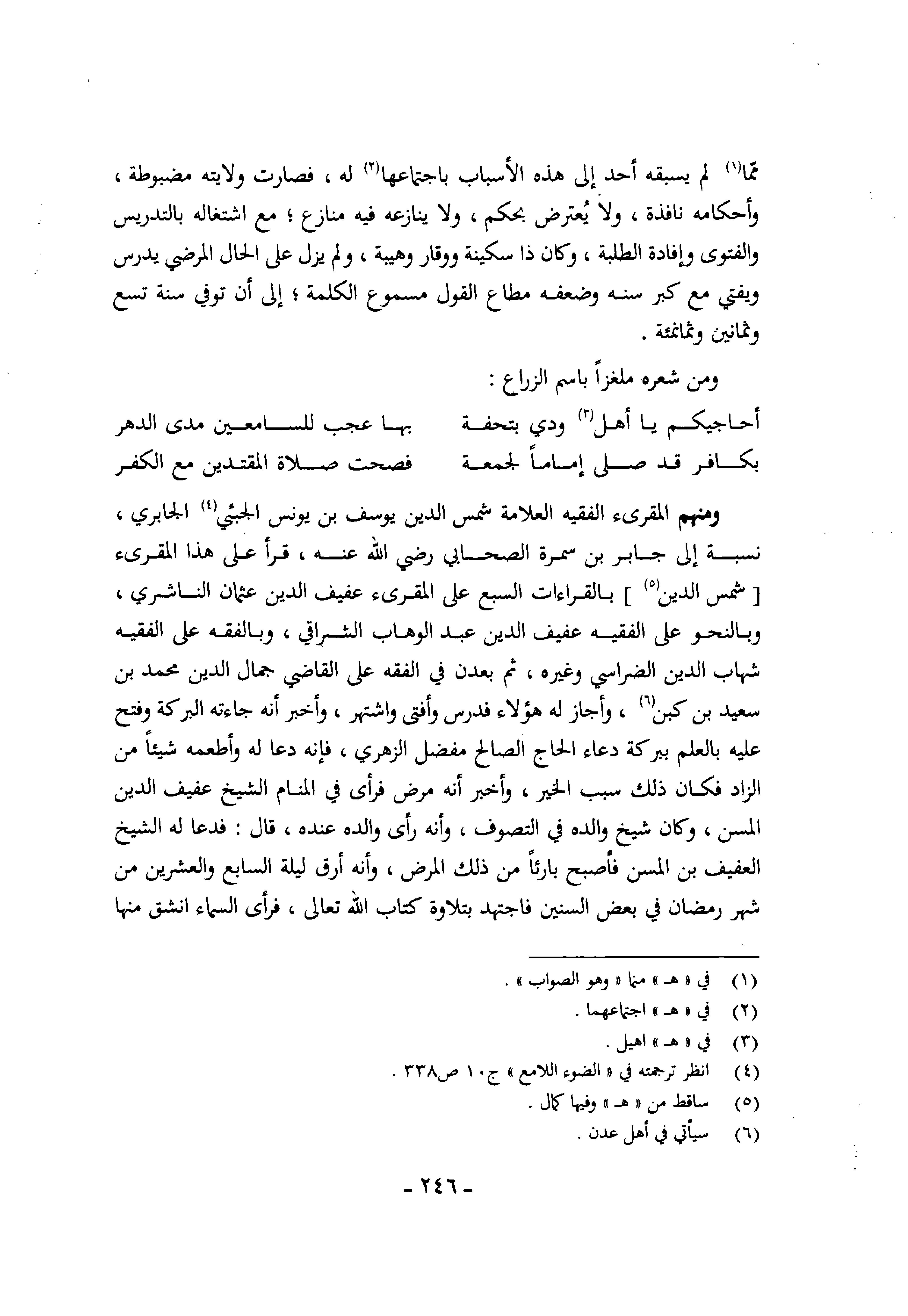وَمِنْهُم المقرىء الْفَقِيه الْعَلامَة شمس الدّين يُوسُف بن يُونُس الجبئي الجابري نِسْبَة إِلَى جَابر بن سَمُرَة الصَّحَابِيّ رَضِي الله عَنهُ قَرَأَ على هَذَا المقرىء شمس الدّين بالقراءات السَّبع على المقرىء عفيف الدّين عُثْمَان النَّاشِرِيّ وبالنحو على الْفَقِيه عفيف الدّين عبد الْوَهَّاب الشراقي وبالفقه على الْفَقِيه شهَاب الدّين الضراسي وَغَيره ثمَّ بعدن فِي الْفِقْه على القَاضِي جمال الدّين مُحَمَّد بن سعيد بن كبن وَأَجَازَ لَهُ هَؤُلَاءِ فدرس وَأفْتى واشتهر وَأخْبر أَنه جائته الْبركَة وَفتح عَلَيْهِ بِالْعلمِ ببركة دُعَاء الْحَاج الصَّالح مفضل الزُّهْرِيّ فَإِنَّهُ دَعَا لَهُ وأطعمه شَيْئا من الزَّاد فَكَانَ ذَلِك سَبَب الْخَيْر وَأخْبر أَنه مرض فَرَأى فِي الْمَنَام الشَّيْخ عفيف الدّين المسن وَكَانَ شيخ وَالِده فِي التصوف وَأَنه رأى وَالِده عِنْده قَالَ فَدَعَا لَهُ الشَّيْخ الْعَفِيف بن المسن فَأصْبح بارئا من ذَلِك الْمَرَض وَأَنه أرق لَيْلَة السَّابِع وَالْعِشْرين من شهر رَمَضَان فِي بعض السنين فاجتهد بِتِلَاوَة كتاب الله تَعَالَى فَرَأى السَّمَاء انْشَقَّ مِنْهَا