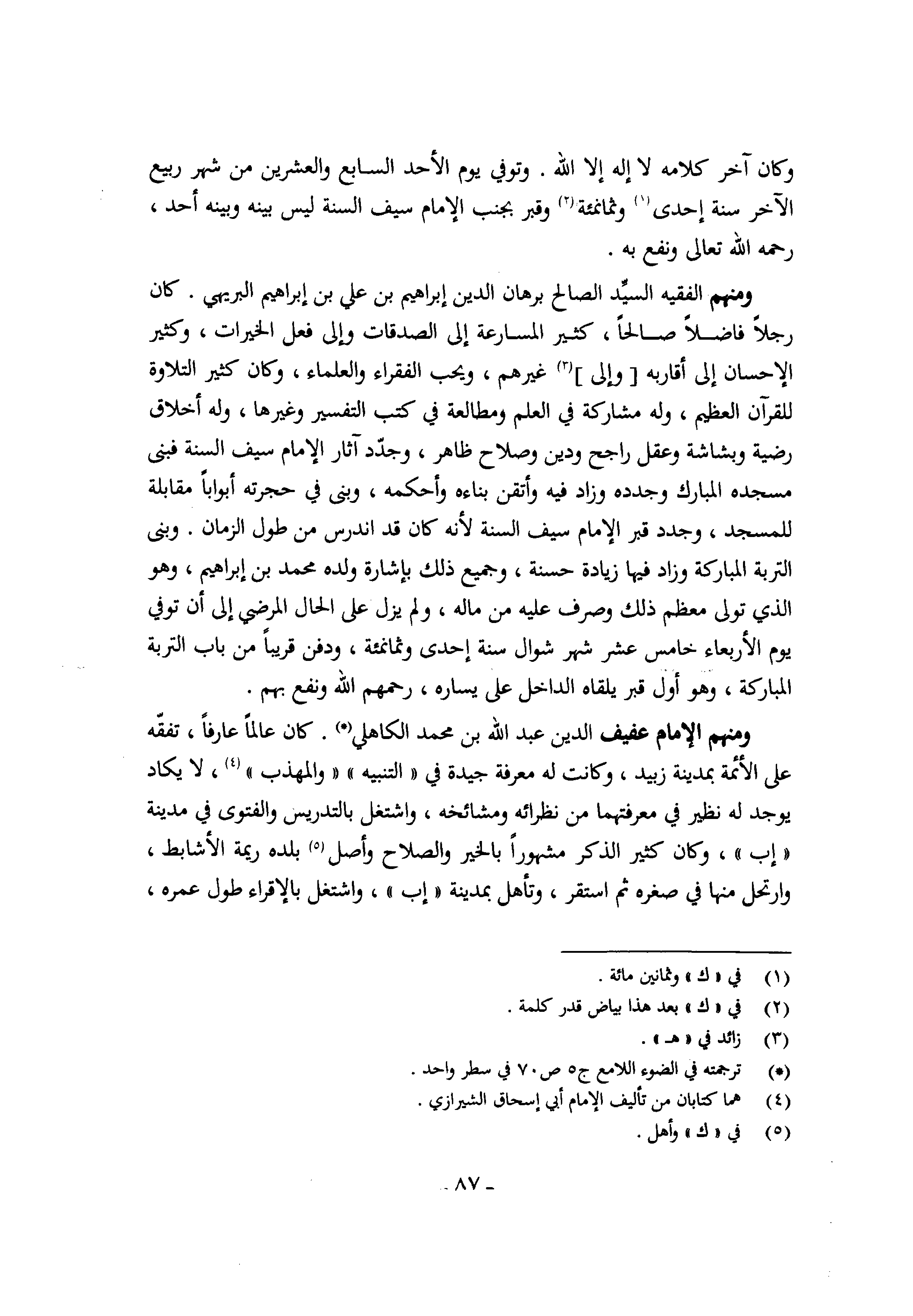 وَكَانَ آخر كَلَامه لَا إِلَه إِلَّا الله وَتُوفِّي يَوْم الْأَحَد السَّابِع وَالْعِشْرين من شهر ربيع الآخر سنة إِحْدَى وثمانمئة وقبر بِجنب الإِمَام سيف السّنة لَيْسَ بَينه وَبَينه أحد رَحمَه الله تَعَالَى ونفع بهومنهم الْفَقِيه السَّيِّد الصَّالح برهَان الدّين إِبْرَاهِيم بن عَليّ بن إِبْرَاهِيم البريهي كَانَ رجلا فَاضلا صَالحا كثير المسارعة إِلَى الصَّدقَات وَإِلَى فعل الْخيرَات وَكثير الْإِحْسَان إِلَى أَقَاربه وَإِلَى غَيرهم وَيُحب الْفُقَرَاء وَالْعُلَمَاء وَكَانَ كثير التِّلَاوَة لِلْقُرْآنِ الْعَظِيم وَله مُشَاركَة فِي الْعلم ومطالعة فِي كتب التَّفْسِير وَغَيرهَا وَله أَخْلَاق رضية وبشاشة وعقل رَاجِح وَدين وَصَلَاح ظَاهر وجدد آثَار الإِمَام سيف السّنة فَبنى مَسْجده الْمُبَارك وجدده وَزَاد فِيهِ وأتقن بناءه وأحكمه وَبنى فِي حجرته أبوابا مُقَابلَة لِلْمَسْجِدِ وجدد قبر الإِمَام سيف السّنة لِأَنَّهُ كَانَ قد اندرس من طول الزَّمَان وَبنى التربة الْمُبَارَكَة وَزَاد فِيهَا زِيَادَة حَسَنَة وَجَمِيع ذَلِك بِإِشَارَة وَلَده مُحَمَّد بن إِبْرَاهِيم وَهُوَ الَّذِي تولى مُعظم ذَلِك وَصرف عَلَيْهِ من مَاله وَلم يزل على الْحَال المرضي إِلَى أَن توفّي يَوْم الْأَرْبَعَاء خَامِس عشر شهر شَوَّال سنة إِحْدَى وثمانمئة وَدفن قَرِيبا من بَاب التربة الْمُبَارَكَة وَهُوَ أول قبر يلقاه الدَّاخِل على يسَاره رَحِمهم الله ونفع بهم