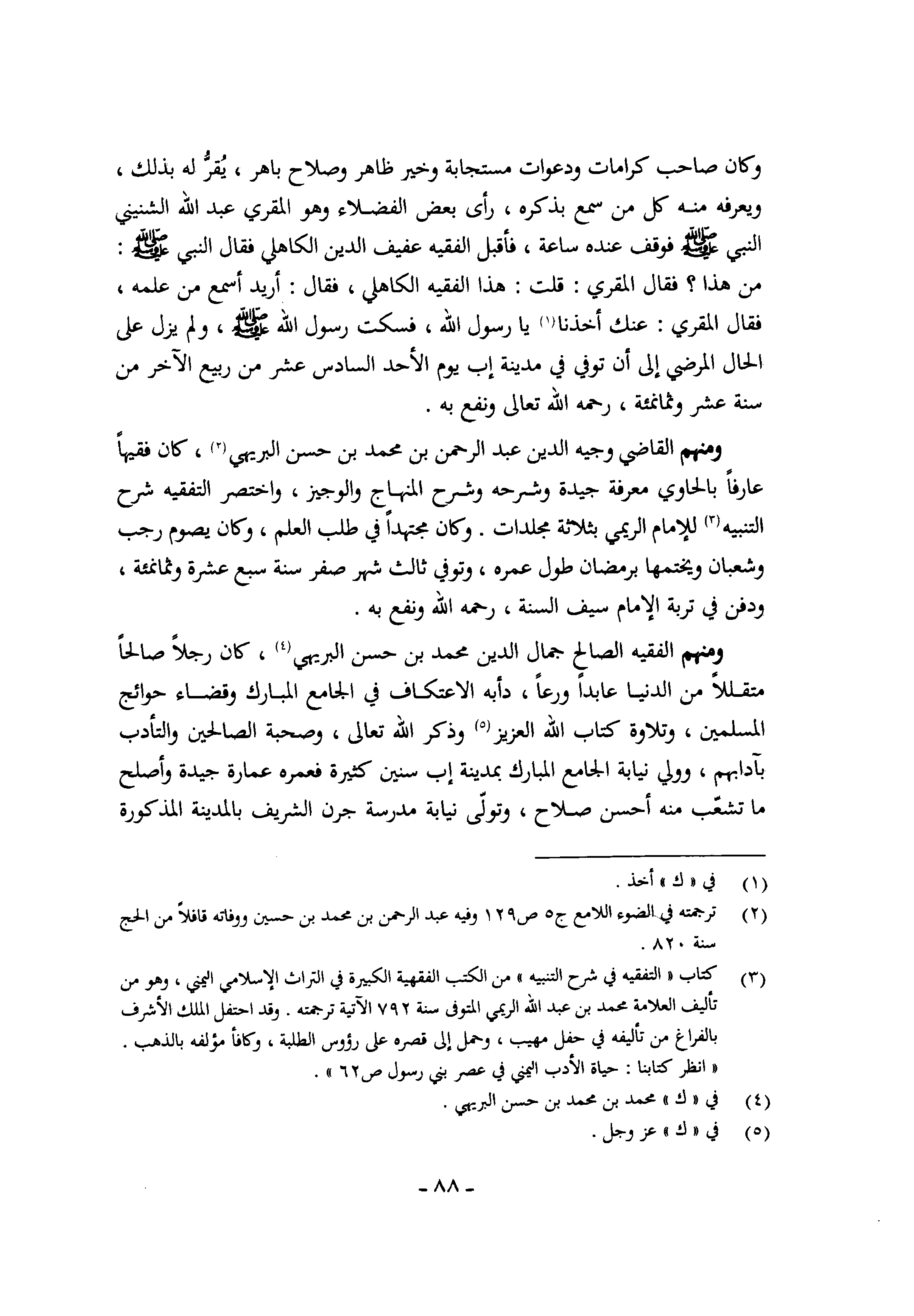 وَمِنْهُم القَاضِي وجيه الدّين عبد الرَّحْمَن بن مُحَمَّد بن حسن البريهي كَانَ فَقِيها عَارِفًا بالحاوي معرفَة جَيِّدَة وَشَرحه وَشرح الْمِنْهَاج وَالْوَجِيز وَاخْتصرَ التفقيه شرح التَّنْبِيه للأمام الريمي بِثَلَاثَة مجلدات وَكَانَ مُجْتَهدا فِي طلب الْعلم وَكَانَ يَصُوم رَجَب وَشَعْبَان ويختمها برمضان طول عمره وَتُوفِّي ثَالِث شهر صفر سنة سبع عشرَة وثمانمئة وَدفن فِي تربة الإِمَام سيف السّنة رَحمَه الله ونفع بِهِ