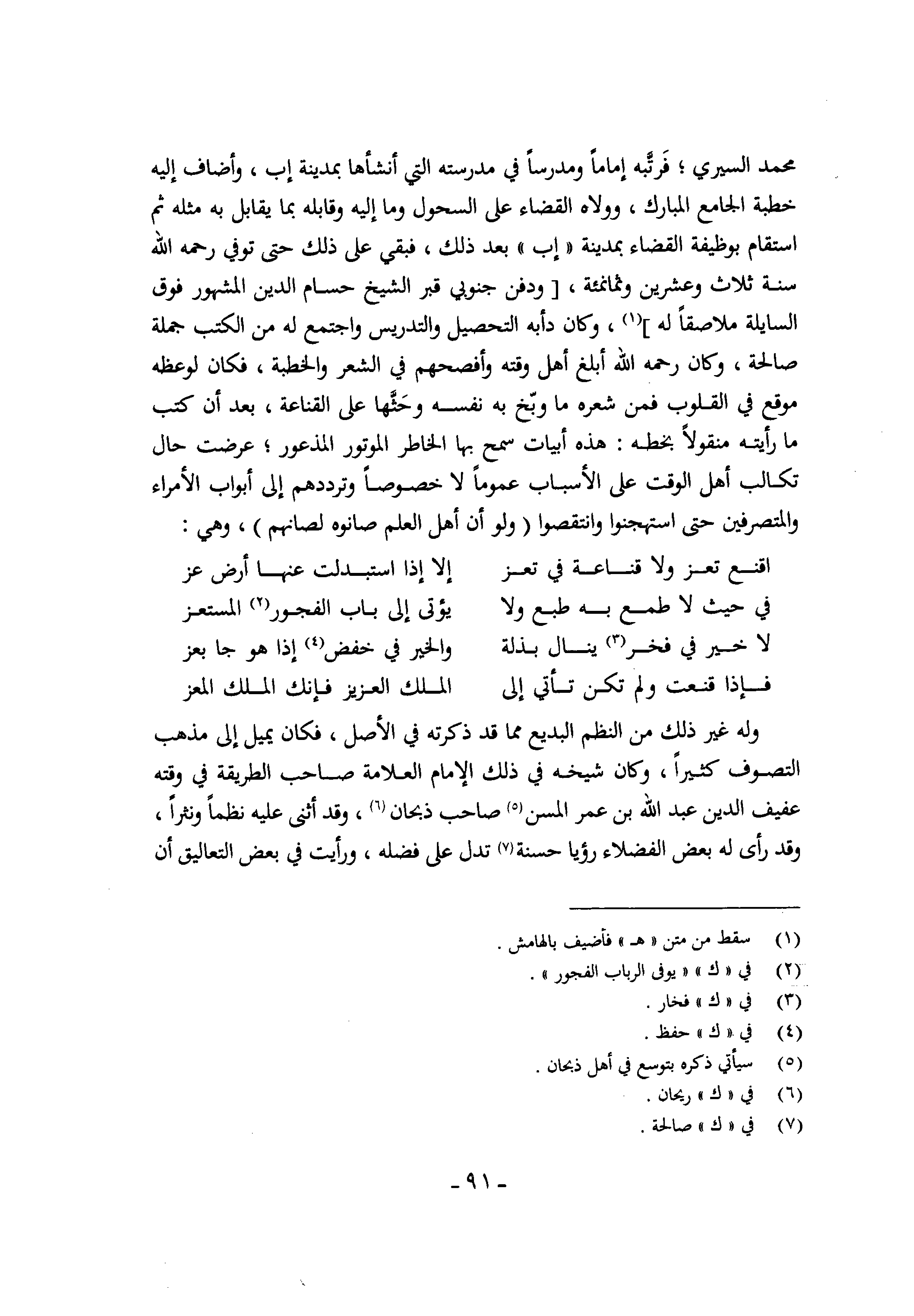 مُحَمَّد السيري فرتبه إِمَامًا ومدرسا فِي مدرسته الَّتِي أَنْشَأَهَا بِمَدِينَة إب وأضاف إِلَيْهِ خطْبَة الْجَامِع الْمُبَارك وولاه الْقَضَاء على السحول وَمَا إِلَيْهِ وقابله بِمَا يُقَابل بِهِ مثله ثمَّ استقام بوظيفة الْقَضَاء بِمَدِينَة إب بعد ذَلِك فَبَقيَ على ذَلِك حَتَّى توفّي رَحمَه الله سنة ثَلَاث وَعشْرين وثمانمئة وَدفن جنوبي قبر الشَّيْخ حسام الدّين الْمَشْهُور فَوق السايلة ملاصقا لَهُ وَكَانَ دأبه التَّحْصِيل والتدريس وَاجْتمعَ لَهُ من الْكتب جملَة صَالِحَة وَكَانَ رَحمَه الله أبلغ أهل وقته وأفصحهم فِي الشّعْر وَالْخطْبَة فَكَانَ لوعظه موقع فِي الْقُلُوب فَمن شعره مَا وبخ بِهِ نَفسه وحثها على القناعة بعد أَن كتب مَا رَأَيْته مَنْقُولًا بِخَطِّهِ هَذِه أَبْيَات سمح بهَا الخاطر الموتور المذعور عرضت حَال تكالب أهل الْوَقْت على الْأَسْبَاب عُمُوما لَا خُصُوصا وترددهم إِلَى أَبْوَاب الْأُمَرَاء والمتصرفين حَتَّى استهجنوا وانتقصوا وَلَو أَن أهل الْعلم صانوه لصانهم وَهِي