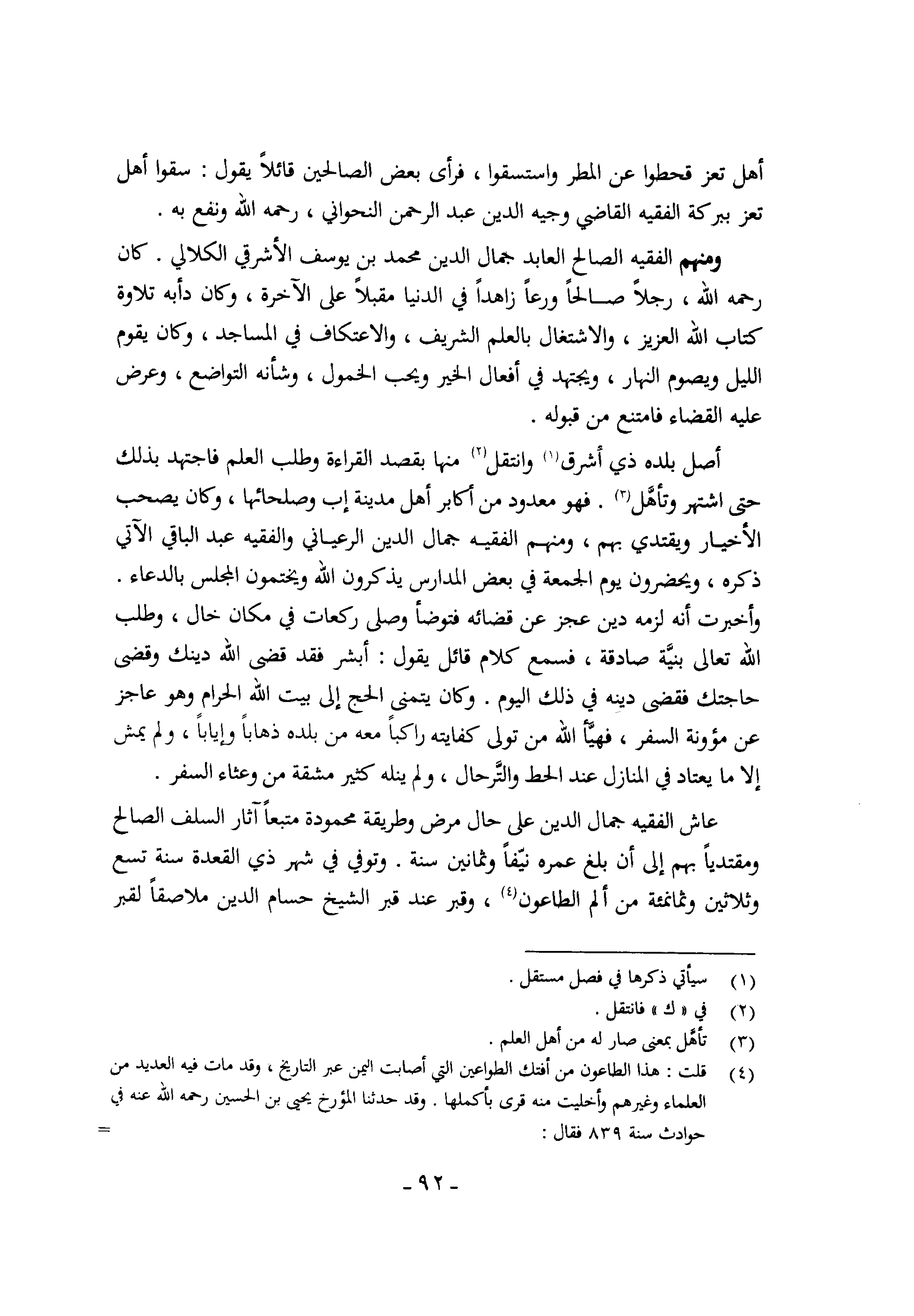 وَمِنْهُم الْفَقِيه الصَّالح العابد جمال الدّين مُحَمَّد بن يُوسُف الأشرقي الكلالي كَانَ رَحمَه الله رجلا صَالحا ورعا زاهدا فِي الدُّنْيَا مُقبلا على الْآخِرَة وَكَانَ دأبه تِلَاوَة كتاب الله الْعَزِيز والاشتغال بِالْعلمِ الشريف وَالِاعْتِكَاف فِي الْمَسَاجِد وَكَانَ يقوم اللَّيْل ويصوم النَّهَار ويجتهد فِي أَفعَال الْخَيْر وَيُحب الخمول وشأنه التَّوَاضُع وَعرض عَلَيْهِ الْقَضَاء فَامْتنعَ من قبُوله