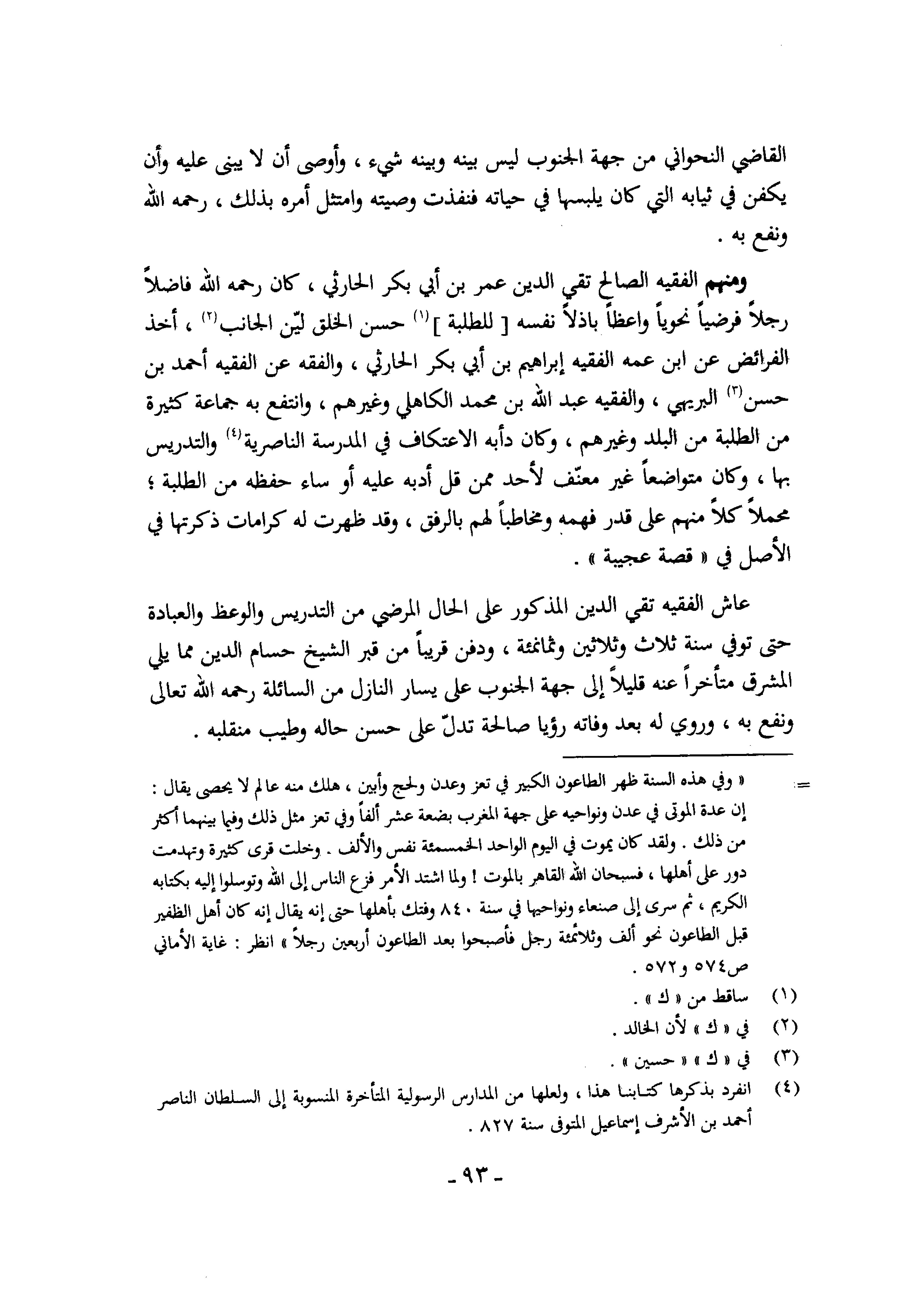 وَمِنْهُم الْفَقِيه الصَّالح تَقِيّ الدّين عمر بن أبي بكر الْحَارِثِيّ كَانَ رَحمَه الله فَاضلا رجلا فرضيا نحويا واعظا باذلا نَفسه للطلبة حسن الْخلق لين الْجَانِب أَخذ الْفَرَائِض عَن ابْن عَمه الْفَقِيه إِبْرَاهِيم بن أبي بكر الْحَارِثِيّ وَالْفِقْه عَن الْفَقِيه أَحْمد بن حسن البريهي والفقيه عبد الله بن مُحَمَّد الْكَاهِلِي وَغَيرهم وانتفع بِهِ جمَاعَة كَثِيرَة من الطّلبَة من الْبَلَد وَغَيرهم وَكَانَ دأبه الِاعْتِكَاف فِي الْمدرسَة الناصرية والتدريس بهَا وَكَانَ متواضعا غير معنف لأحد مِمَّن قل أدبه عَلَيْهِ أَو سَاءَ حفظه من الطّلبَة محملًا كلا مِنْهُم على قدر فهمه ومخاطبا لَهُم بالرفق وَقد ظَهرت لَهُ كرامات ذكرتها فِي الأَصْل فِي قصَّة عَجِيبَة
