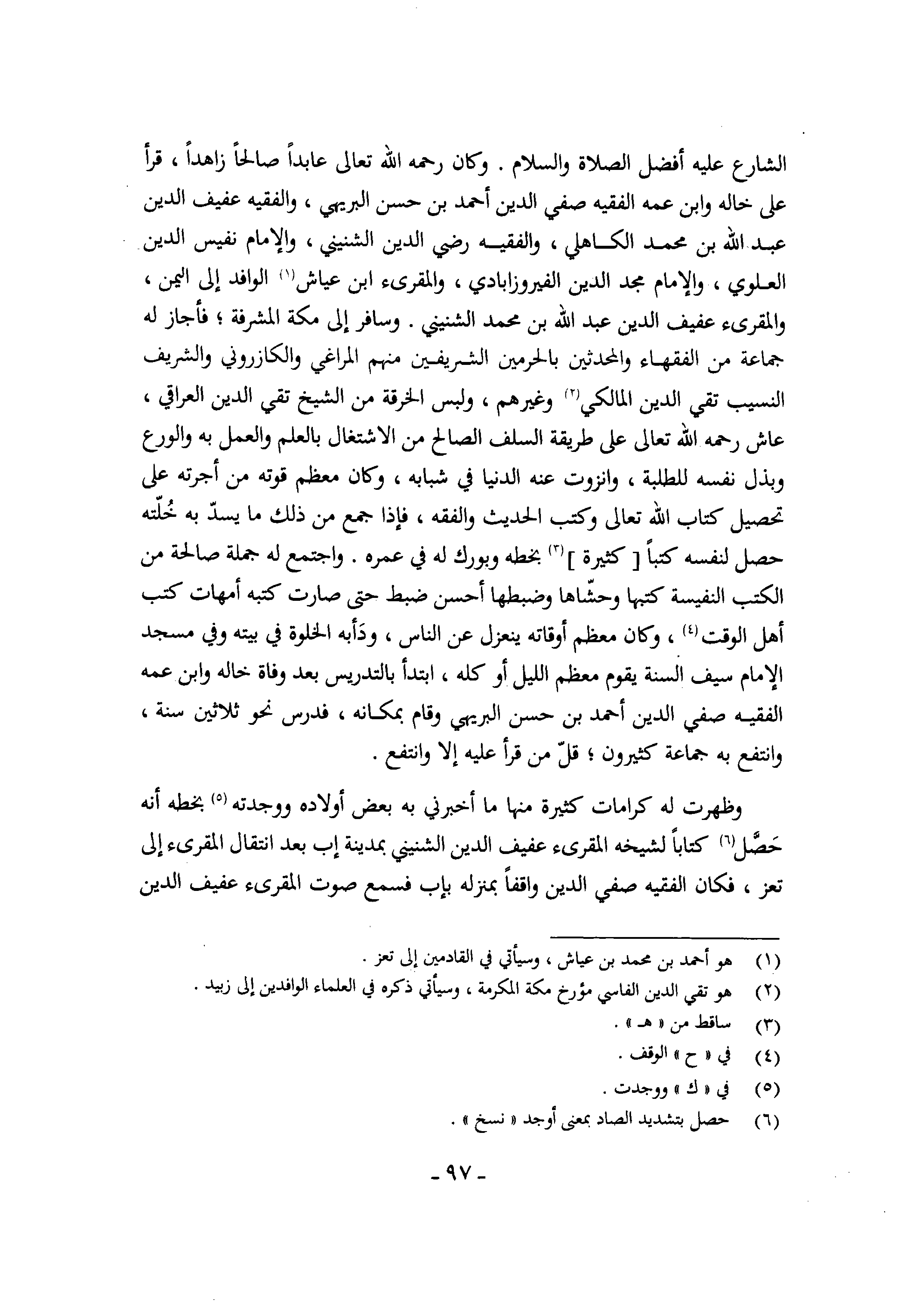الشَّارِع عَلَيْهِ أفضل الصَّلَاة وَالسَّلَام وَكَانَ رَحمَه الله تَعَالَى عابدا صَالحا زاهدا قَرَأَ على خَاله وَابْن عَمه الْفَقِيه صفي الدّين أَحْمد بن حسن البريهي والفقيه عفيف الدّين عبد الله بن مُحَمَّد الْكَاهِلِي والفقيه رَضِي الدّين الشنيني وَالْإِمَام نَفِيس الدّين الْعلوِي وَالْإِمَام مجد الدّين الفيروزابادي والمقرىء ابْن عَيَّاش الْوَافِد إِلَى الْيمن والمقرىء عفيف الدّين عبد الله بن مُحَمَّد الشنيني وسافر إِلَى مَكَّة المشرفة فَأجَاز لَهُ جمَاعَة من الْفُقَهَاء والمحدثين بالحرمين الشريفين مِنْهُم المراغي والكازروني والشريف النسيب تَقِيّ الدّين الْمَالِكِي وَغَيرهم وَلبس الْخِرْقَة من الشَّيْخ تَقِيّ الدّين الْعِرَاقِيّ عَاشَ رَحمَه الله تَعَالَى على طَريقَة السّلف الصَّالح من الِاشْتِغَال بِالْعلمِ وَالْعَمَل بِهِ والورع وبذل نَفسه للطلبة وانزوت عَنهُ الدُّنْيَا فِي شبابه وَكَانَ مُعظم قوته من أجرته على تَحْصِيل كتاب الله تَعَالَى وَكتب الحَدِيث وَالْفِقْه فَإِذا جمع من ذَلِك مَا يسد بِهِ خلته حصل لنَفسِهِ كتبا كَثِيرَة بِخَطِّهِ وبورك لَهُ فِي عمره وَاجْتمعَ لَهُ جملَة صَالِحَة من الْكتب النفيسة كتبهَا وحشاها وضبطها أحسن ضبط حَتَّى صَارَت كتبه أُمَّهَات كتب أهل الْوَقْت وَكَانَ مُعظم أوقاته يَنْعَزِل عَن النَّاس ودأبه الْخلْوَة فِي بَيته وَفِي مَسْجِد الإِمَام سيف السّنة يقوم مُعظم اللَّيْل أَو كُله ابْتَدَأَ بالتدريس بعد وَفَاة خَاله وَابْن عَمه الْفَقِيه صفي الدّين أَحْمد بن حسن البريهي وَقَامَ بمكانه فدرس نَحْو ثَلَاثِينَ سنة وانتفع بِهِ جمَاعَة كَثِيرُونَ قل من قَرَأَ عَلَيْهِ إِلَّا وانتفع