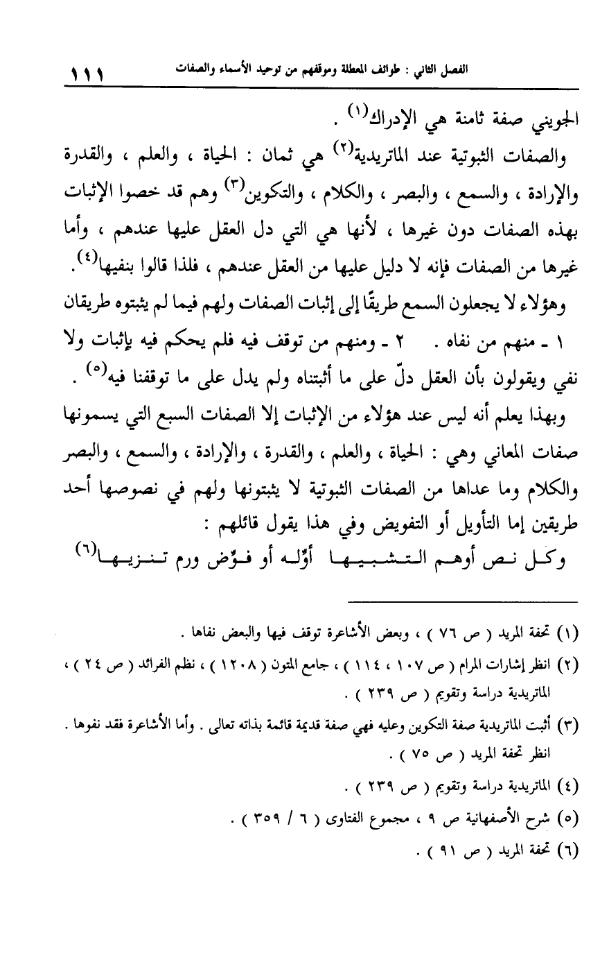 3 أثبت الماتريدية صفة التكوين وعليه فهي صفة قديمة قائمة بذاته تعالى. وأما الأشاعرة فقد نفوها. انظر تحفة المريد (ص 75) .