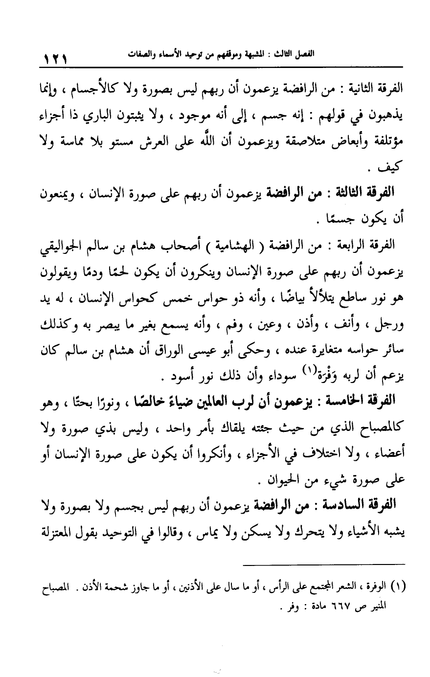 الفرقة الرابعة: من الرافضة (الهشامية) أصحاب هشام بن سالم الجواليقي يزعمون أن ربهم على صورة الإنسان وينكرون أن يكون لحما ودما ويقولون هو نور ساطع يتلألأ بياضا، وأنه ذو حواس خمس كحواس الإنسان، له يد ورجل، وأنف، وأذن، وعين، وفم، وأنه يسمع بغير ما ييصر به وكذلك سائر حواسه متغايرة عنده، وحكى أبو عيسى الوراق أن هشام بن سالم كان يزعم أن لربه وفرة1 سوداء وأن ذلك نور أسود.