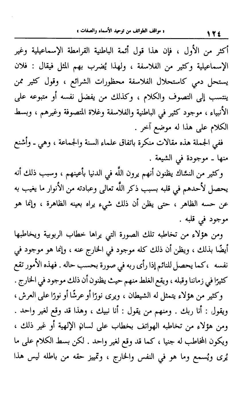 ومن هؤلاء من تخاطبه تلك الصورة التي يراها خطاب الربوبية ويخاطبها أيضا بذلك، ويظن أن ذلك كله موجود في الخارج عنه، وإنما هو موجود في نفسه، كما يحصل للنائم إذا رأى ربه في صورة بحسب حاله. فهذه الأمور تقع كثيرا في زماننا وقبله، ويقع الغلط منهم حيث يظنون أن ذلك موجود في الخارج. وكثير من هؤلاء يتمثل له الشيطان، ويرى نورا أو عرشا أو نورا على العرش، ويقول أنا ربك. ومنهم من يقول: أنا نبيك، وهذا قد وقع لغير واحد. ومن هؤلاء من تخاطبه الهواتف بخطاب على لسان الإلهية أو غير ذلك، ويكون الخاطب له جنيا، كما قد وقع لغير واحد. لكن بسط الكلام على ما يرى ويسمع وما هو في النفس والخارج، وتمييز حقه من باطله ليس هذا