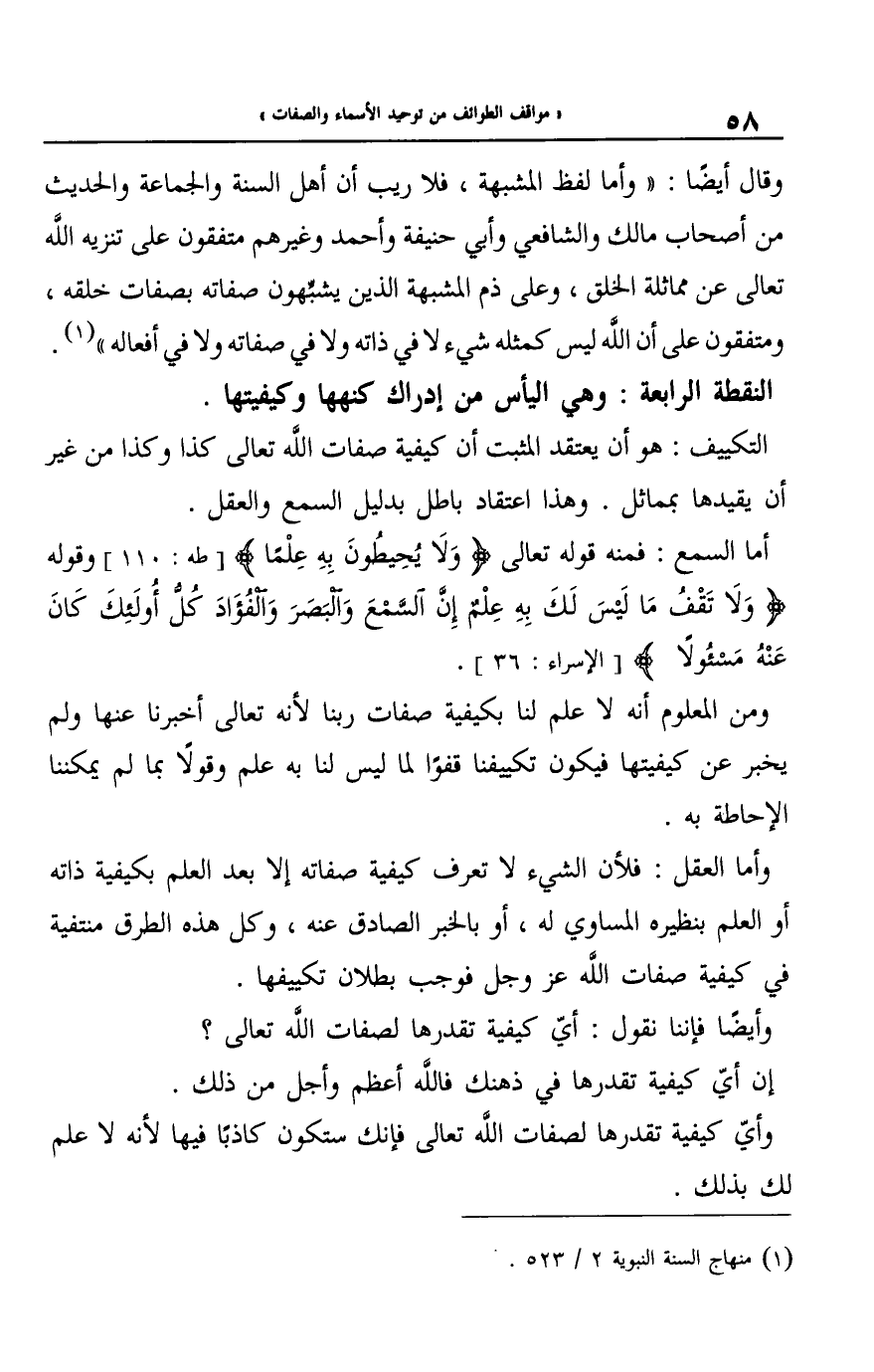 وفي هذا الباب يقول ابن القيم رحمه الله تعالى: "الثالث: عدم تشبيهها بما للمخلوق، فإن الله سبحانه ليس كمثله شيء، لا في ذاته، ولا في صفاته ولا في أفعاله، فالعارفون به، المصدقون لرسله، المقرون بكماله: يثبتون له الأسماء والصفات، وينفون عنه مشابهة المخلوقات فيجمعون بين الإثبات ونفي التشبيه، وبين التنزيه وعدم التعطيل، فمذهبهم حسنة بين سيئتين، وهدى بين ضلالتين، فصراطهم صراط المنعم عليهم، وصراط غيرهم صراط المغضوب عليهم والضالين. قال الإمام أحمد: "لا نزيل عن الله صفة من صفاته لأجل شناعة المشنعين"1 وقال: "التشبيه: أن تقول يد كيدي"2 تعالى الله عن ذلك علوا كبيرا"3.