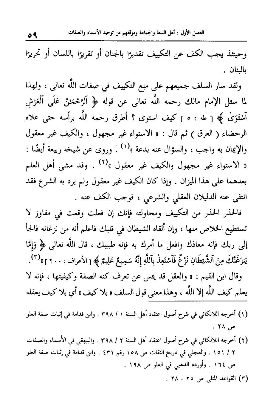 وقال ابن القيم: "والعقل قد يئس عن تعرف كنه الصفة وكيفيتها، فإنه لا يعلم كيف الله إلا الله، وهذا معنى قول السلف "بلا كيف" أي بلا كيف يعقله