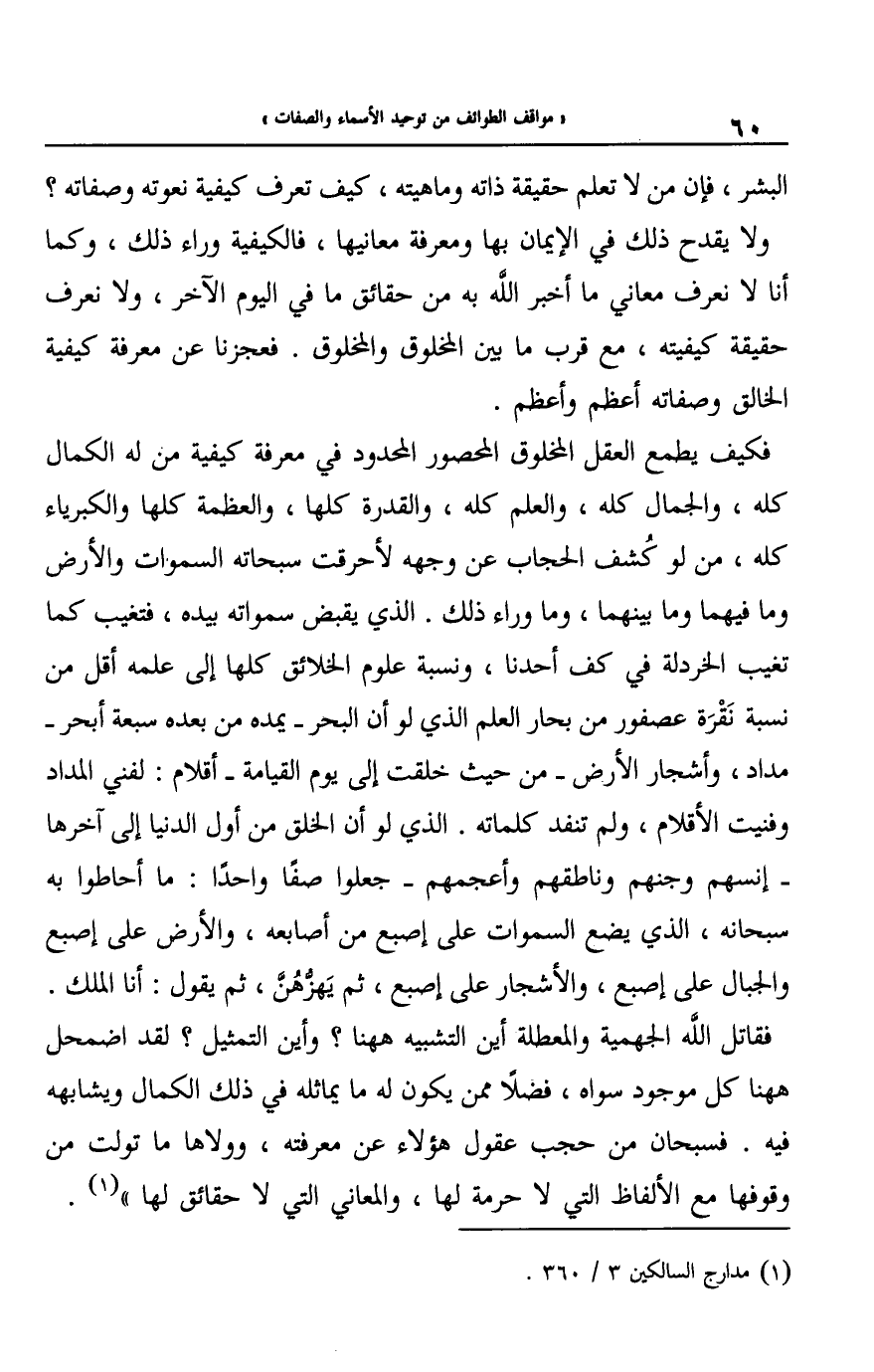 فكيف يطمع العقل المخلوق المحصور المحدود في معرفة كيفية من له الكمال كله، والجمال كله، والعلم كله، والقدرة كلها، والعظمة كلها والكبرياء كله، من لو كشف الحجاب عن وجهه لأحرقت سبحاته السموات والأرض وما فيهما وما بينهما، وما وراء ذلك. الذي يقبض سمواته بيده، فتغيب كما تغيب الخردلة في كف أحدنا، ونسبة علوم الخلائق كلها إلى علمه أقل من نسبة نقرة عصفور من بحار العلم الذي لو أن البحر- يمده من بعده سبعة أبحر- مداد، وأشجار الأرض- من حيث خلقت إلى يوم القيامة- أقلام: لفني المداد وفنيت الأقلام، ولم تنفد كلماته. الذي لو أن الخلق من أول الدنيا إلى آخرها - إنسهم وجنهم وناطقهم وأعجمهم- جعلوا صفا واحدا: ما أحاطوا به سبحانه، الذي يضع السموات على إصبع من أصابعه، والأرض على إصبع والجبال على إصبع، والأشجار على إصبع، ثم يهزهن، ثم يقول: أنا الملك. فقاتل الله الجهمية والمعطلة أين التشبيه ههنا؟ وأين التمثيل؟ لقد اضمحل ههنا كل موجود سواه، فضلا ممن يكون له ما يماثله في ذلك الكمال ويشابهه فيه. فسبحان من حجب عقول هؤلاء عن معرفته، وولاها ما تولت من وقوفها مع الألفاظ التي لا حرمة لها، والمعاني التي لا حقائق لها"1. (1)