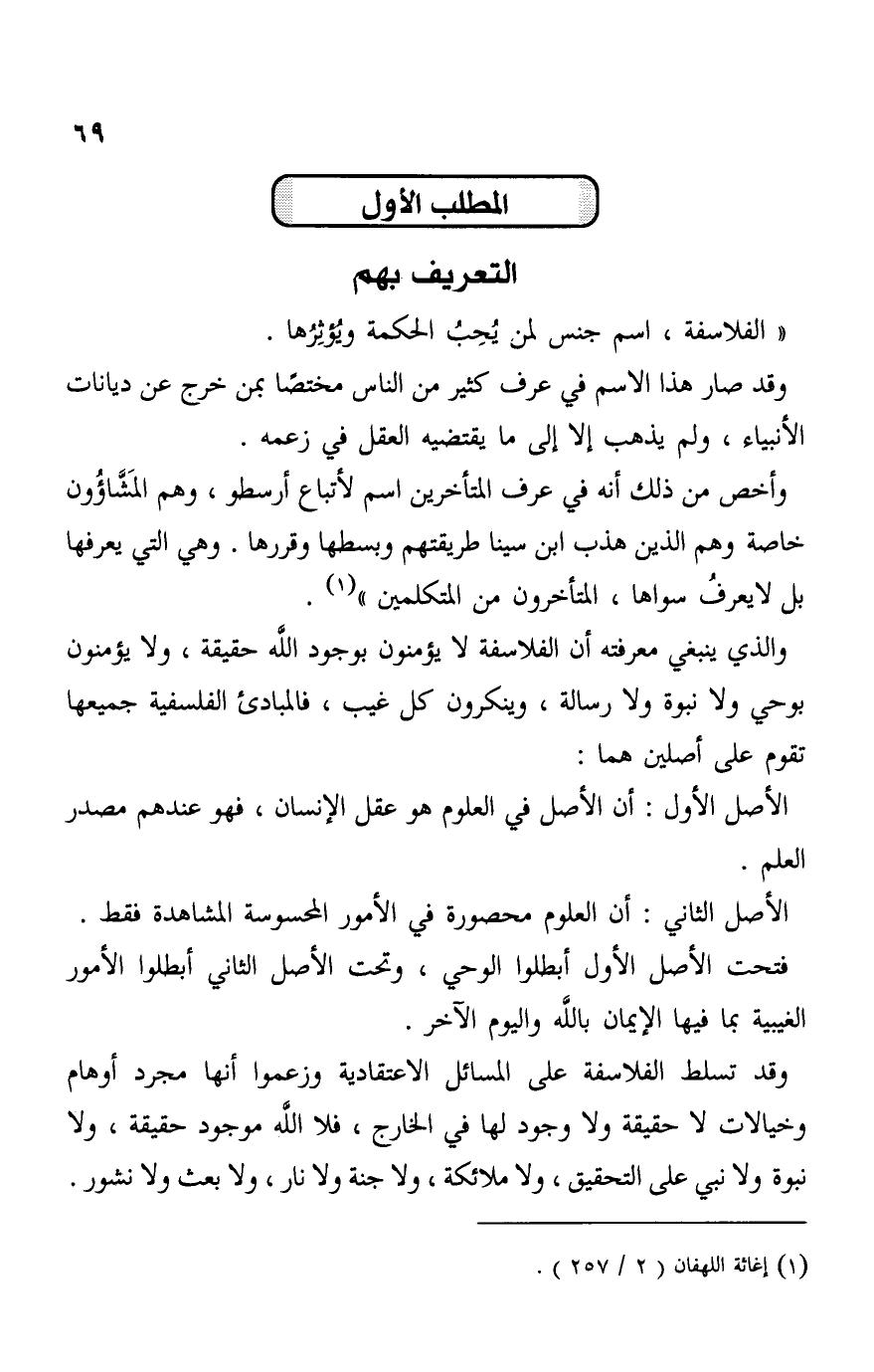 وأخص من ذلك أنه في عرف المتأخرين اسم لأتباع أرسطو، وهم المشاؤون خاصة وهم الذين هذب ابن سينا طريقتهم وبسطها وقررها. وهي التي يعرفها بل لا يعرف سواها المتأخرون من المتكلمين"1.
