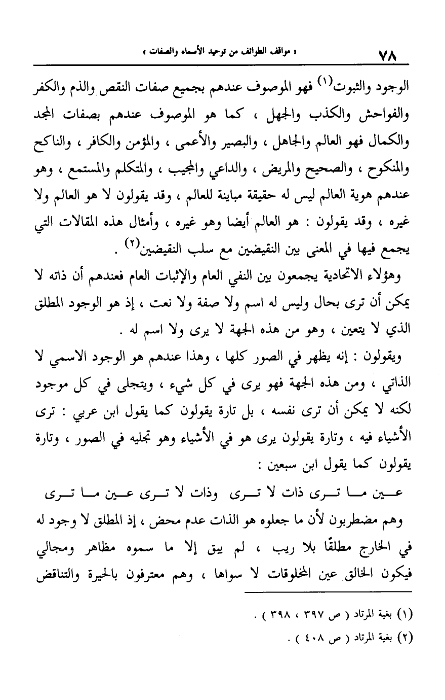 وهؤلاء الاتحادية يجمعون بين النفي العام والإثبات العام فعندهم أن ذاته لا يمكن أن ترى بحال وليس له اسم ولا صفة ولا نعت، إذ هو الوجود المطلق الذي لا يتعين، وهو من هذه الجهة لا يرى ولا اسم له.