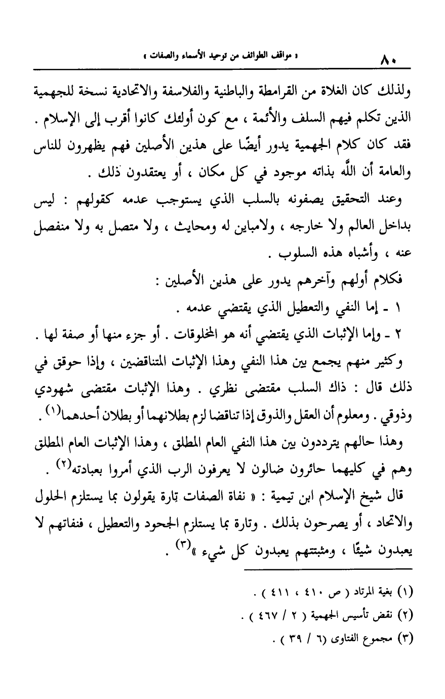 قال شيخ الإسلام ابن تيمية: "نفاة الصفات تارة يقولون بما يستلزم الحلول والاتحاد، أو يصرحون بذلك. وتارة بما يستلزم الجحود والتعطيل، فنفاتهم لا يعبدون شيئا، ومثبتتهم يعبدون كل شيء "3.