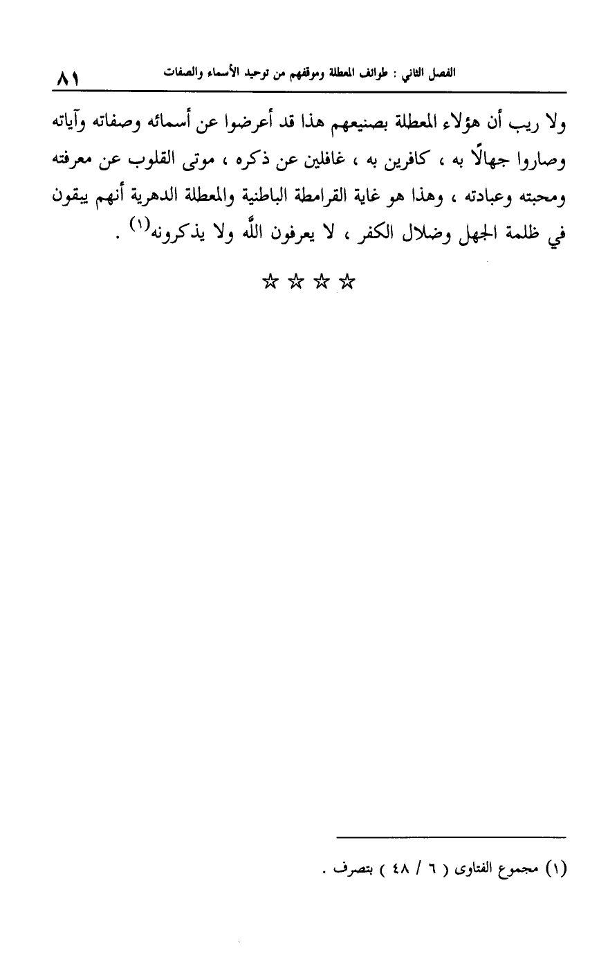 قال شيخ الإسلام ابن تيمية: "نفاة الصفات تارة يقولون بما يستلزم الحلول والاتحاد، أو يصرحون بذلك. وتارة بما يستلزم الجحود والتعطيل، فنفاتهم لا يعبدون شيئا، ومثبتتهم يعبدون كل شيء "3.