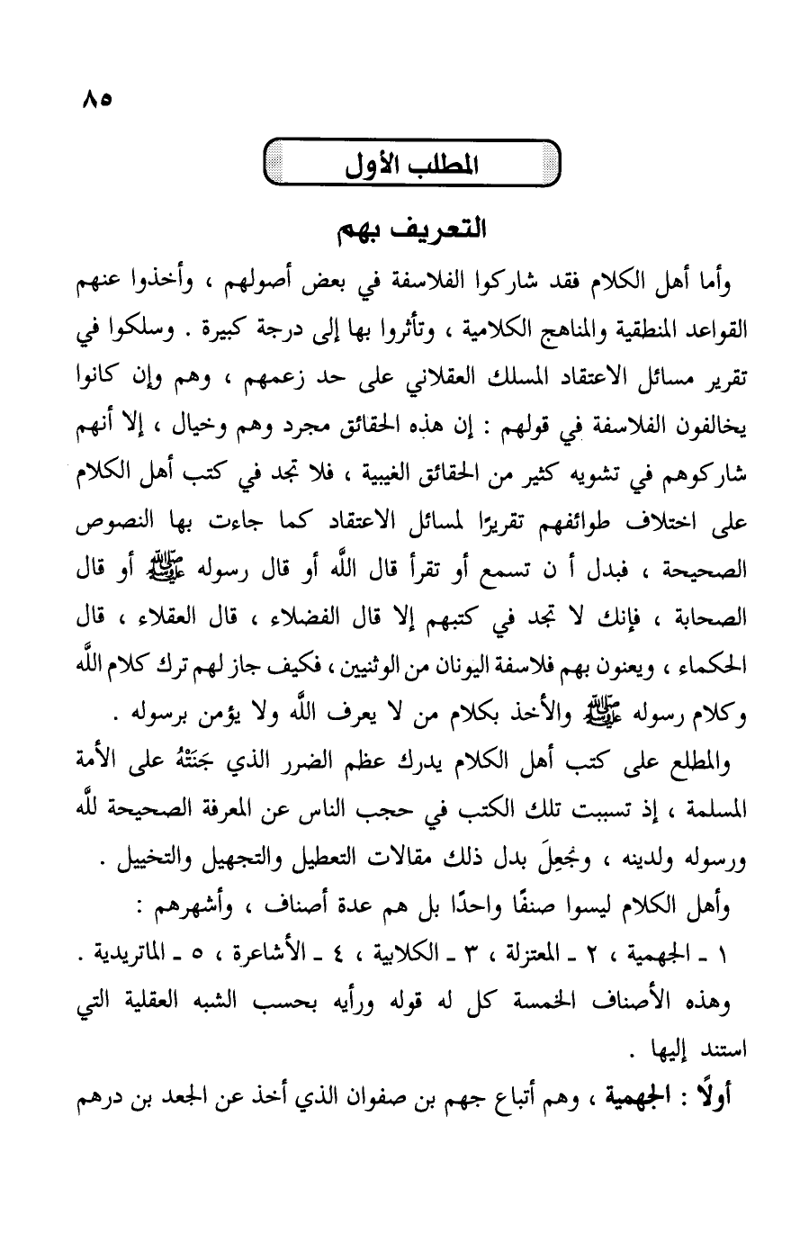 1- الجهمية، 2- المعتزلة، 3- الكلابية، 4- الأشاعرة، 5- الماتريدية. وهذه الأصناف الخمسة كل له قوله ورأيه بحسب الشبه العقلية التي استند إليها.