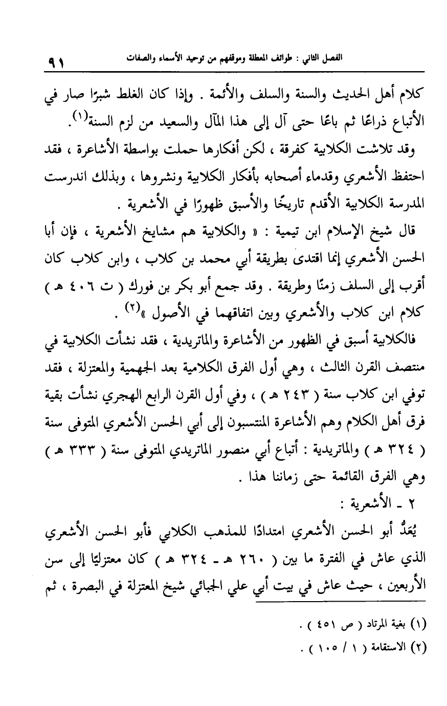 كلام أبي الحسن الأشعري وقدماء أصحابه، ويوجد في كلام أبي الحسن الأشعري من النفي الذي أخذه من المعتزلة ما لا يوجد في كلام أبي محمد بن كلاب الذي أخذ أبو الحسن طريقه. ويوجد في كلام ابن كلاب من النفي الذي قارب فيه المعتزلة ما لا يوجد في كلام أهل الحديث والسنة والسلف والأئمة. وإذا كان الغلط شبرا صار في الأتباع ذراعا ثم باعا حتى آل إلى هذا المآل والسعيد من لزم السنة1