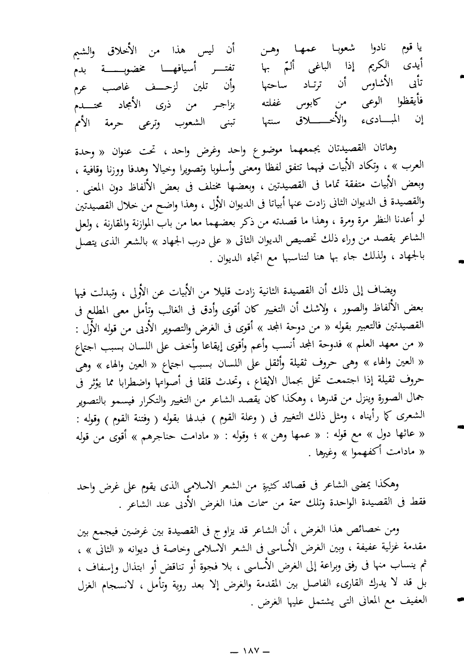وهكذا يمضي الشاعر في قصائد كثيرة من الشعر الإسلامي الذي يقوم على غرض واحد فقط في القصيدة الواحدة، وتلك سمة من سمات هذا الغرض الأدبي عند الشاعر.