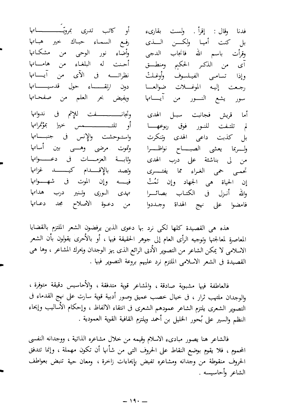 هذه هي القصيدة كلها لكي نرد بها دعوى الذين يرفضون الشعر الملتزم بالقضايا المعاصرة لمعالجتها، وتوجيه الرأي العام إلى جوهر الحقيقة فيها، أو بالأحرى يقولون بأنَّ الشعر الإسلامي لا يمكن الشاعر من التصوير الأدبي الرائع الذي يهز الوجدان ويحرك المشاعر، وها هي القصيدة في الشعر الإسلامي الملتزم نرد عليهم بروعة التصوير فيها.