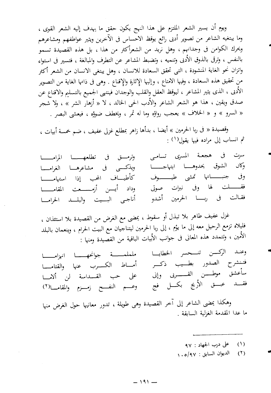 ويوم أن يسير الشعر الملتزم على هذا النهج يكون حقق ما يهدف إليه الشعر القويّ، وما يبتغيه الشاعر من تصوير أدبي رائع يوقظ الإحساس في الآخرين، ويثير عواطفهم ومشاعرهم، ويحرك الكوامن في وجدانهم، وهل نريد من الشعر أكثر من هذا، بل هذه القصيدة تسمو بالنفس، وترقى بالذوق الأدبي وتنميه، وتضبط المشاعر عن التطرف والمبالغة، فتسير في استواء واتِّزان نحو الغاية المنشودة، التي تحقق السعادة للإنسان، وهل يبتغي الإنسان من الشعر أكثر من تحقيق هذه السعادة، وفيها الامتاع، وإليها الإثارة والإقناع، وهي في ذاتها الغاية من التصوير الأدبي، الذي يثير المشاعر، ليوقظ العقل والقلب والوجدان فينتهي الجميع بالتسليم والإقناع عن صدق ويقين، هذا هو الشعر الشاعر والأدب الحي الخالد، لا "أزهار الشر" ولا شجر "السرو" و "الخلاف" يعجب رواؤه وما له ثمر، ويخطف ضؤوه، فيعشى البصر.