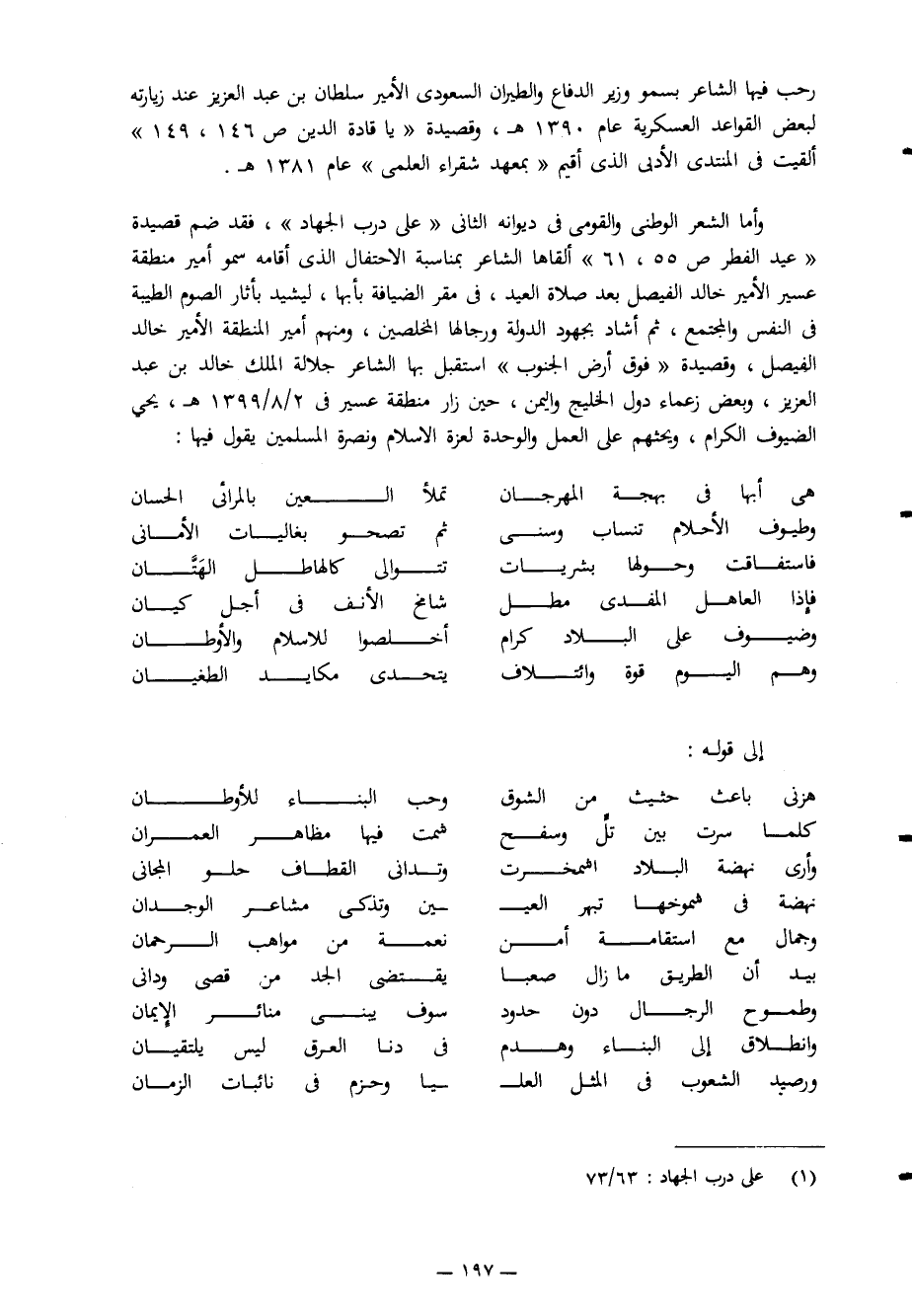 وأما الشعر الوطني والقومي في ديوانه الثاني "على درب الجهاد" فقد ضم قصيدة "عيد الفطر ص55، 61"، ألقاها الشاعر بمناسبة الاحتفال الذي أقامه سمو أمير منطقة عسير الأمير خالد الفيصل بعد صلاة العيد، في مقر الضيافة بأبها؛ ليشيد بأثار الصوم الطيبة في النفس والمجتمع، ثم أشاد بجهود الدولة ورجالها المخلصين، ومنهم أمير المنطقة الأمير خالد الفيصل، وقصيدة "فوق أرض الجنوب" استقبل بها الشاعر جلالة الملك خالد بن عبد العزيز، وبعض زعماء دول الخليج واليمن، حين زار منطقة عسير في 2/ 8/ 1399هـ، يحيي الضيوف الكرام، ويحثهم على العمل والوحدة لعزة الإسلام ونصرة المسلمين يقول فيها: