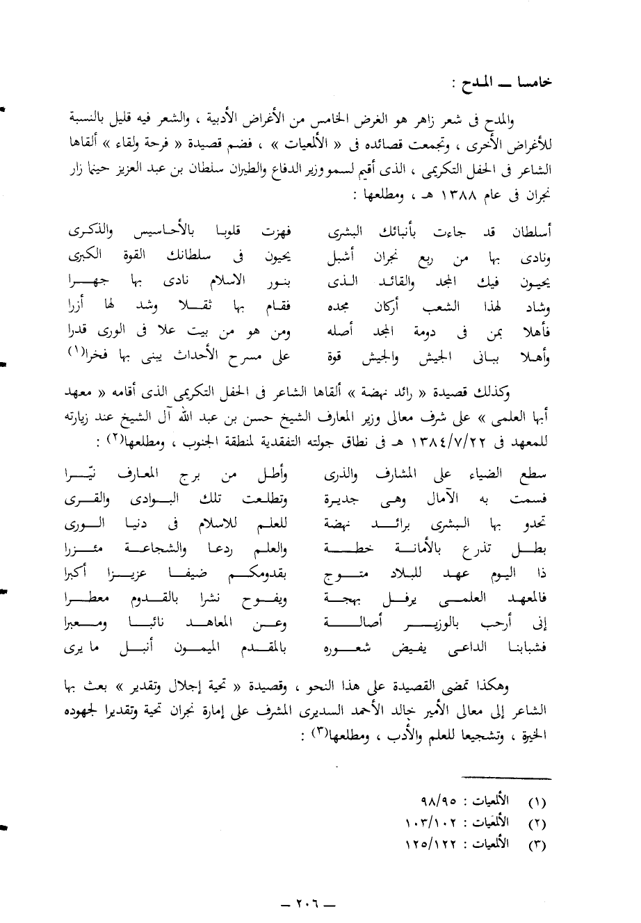 وهكذا تمضي القصيدة على هذا النحو، وقصيدة "تحية إجلال وتقدير" بعث بها الشاعر إلى معالي الأمير خالد أحمد السديري المشرف على إمارة نجران تحية وتقديرًا لجهوده الخيرة، وتشجيعًا للعلم والأدب، ومطلعها3: