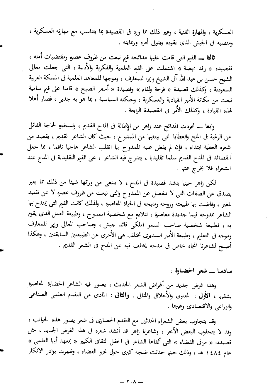 لكن زاهر حينما ينشد قصيدة في المدح لا يبتغي من ورائها شيئًا من ذلك مما يعبر بصدق عن الصفات التي لا تنفصل عن الممدوح، والتي نبعت من ظروف عصره لا عن تقليد للغير، وفاضت بها طبيعته وروحه ومنهجه في الحياة المعاصرة، ولذلك كانت القيم التي يمتدح بها الشاعر ممدوحه قيمًا جديدة معاصرة، تتلاءم مع شخصية الممدوح، وطبيعة العمل الذي يقوم به، فطبيعة شخصية صاحب السمو الملكي قائد جيش، وصاحب المعالي وزير للمعارف وموجه في التعليم، وطبيعة الأمير السديري تختلف هي الأخرى عن الطبيعتين السابقتين، وهكذا أصبح لشاعرنا اتجاه خاص في مدحه يختلف فيه عن المدح في الشعر القديم.