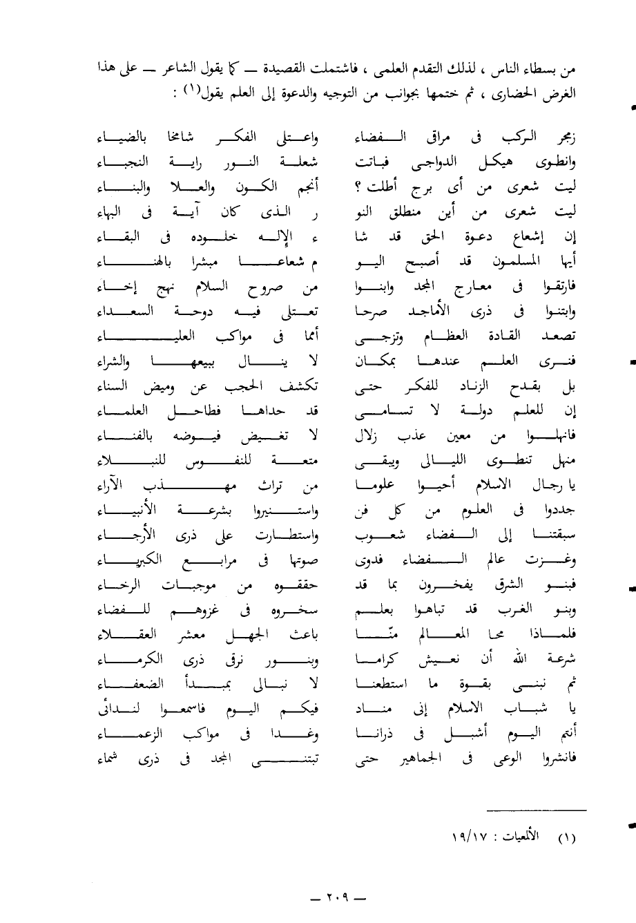 من بسطاء الناس لذلك التقدم العلمي، فاشتملت القصيدة -كما يقول الشاعر- على هذا الغرض الحضاري، ثم ختمها بجوانب من التوجيه والدعوة إلى العلم، يقول1: