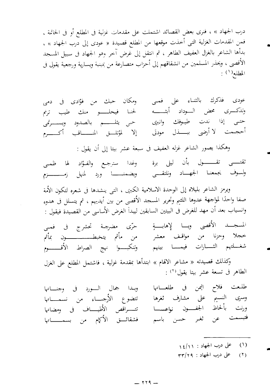 درب الجهاد"، فنرى بعض القصائد اشتملت على مقدمات غزلية في المطلع أو في الخاتمة، فمن المقدمات الغزلية التي أخذت موقعها من المطلع قصيدة "عودي إلى درب الجهاد"، بدأها الشاعر بالغزل العفيف الطاهر، ثم انتقل إلى غرض آخر وهو الجهاد في سبيل المسجد الأقصى، ويحذر المسلمين من انشقاقهم إلى أحزاب متصارعة من يمينية ويسارية ورجعية، يقول في المطلع1: