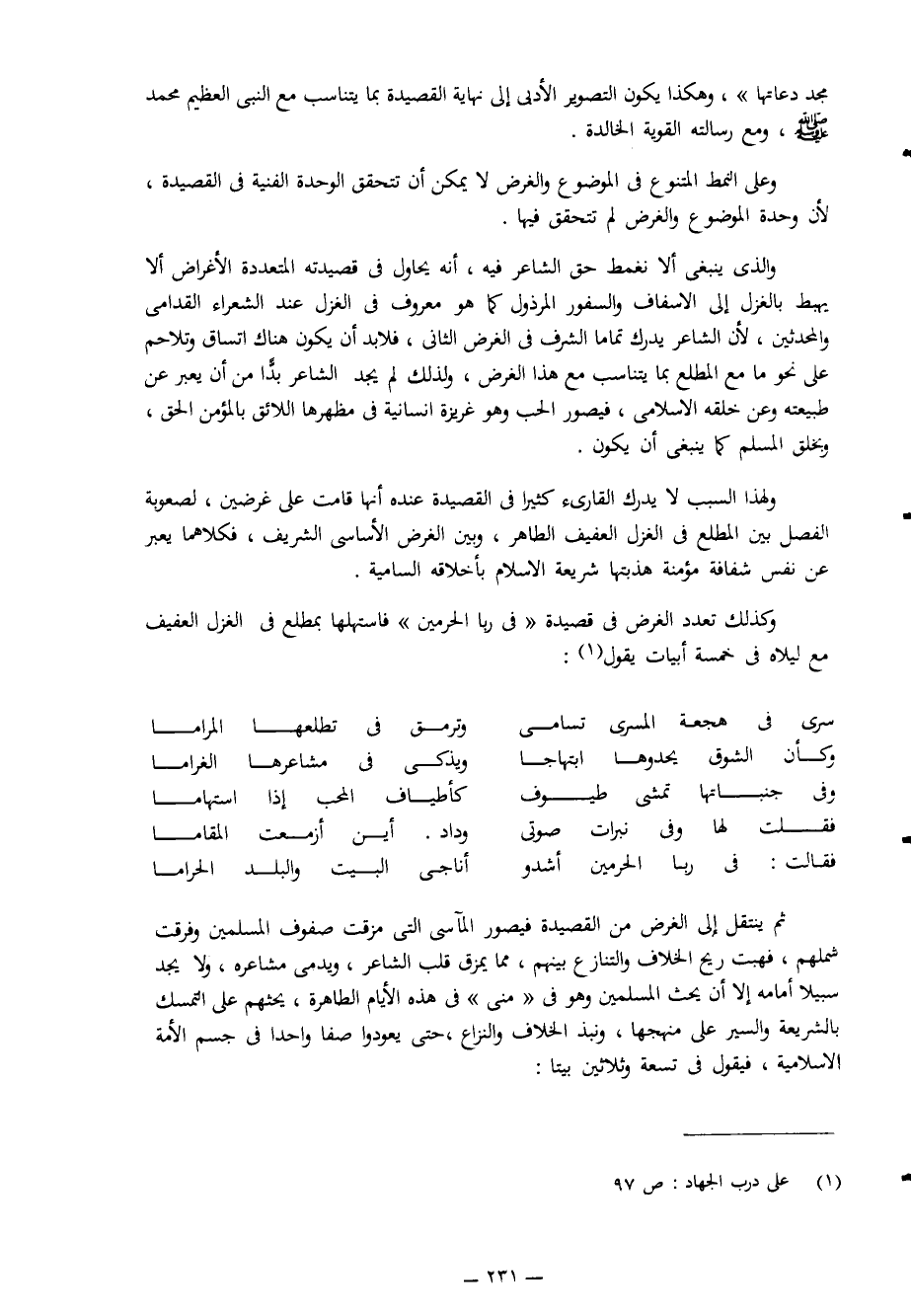 وكذلك تعدد الغرض في قصيدة "في ربا الحرمين"، فاستهلَّها بمطلع في الغزل العفيف مع ليلاه في خمسة أبيات يقول1: