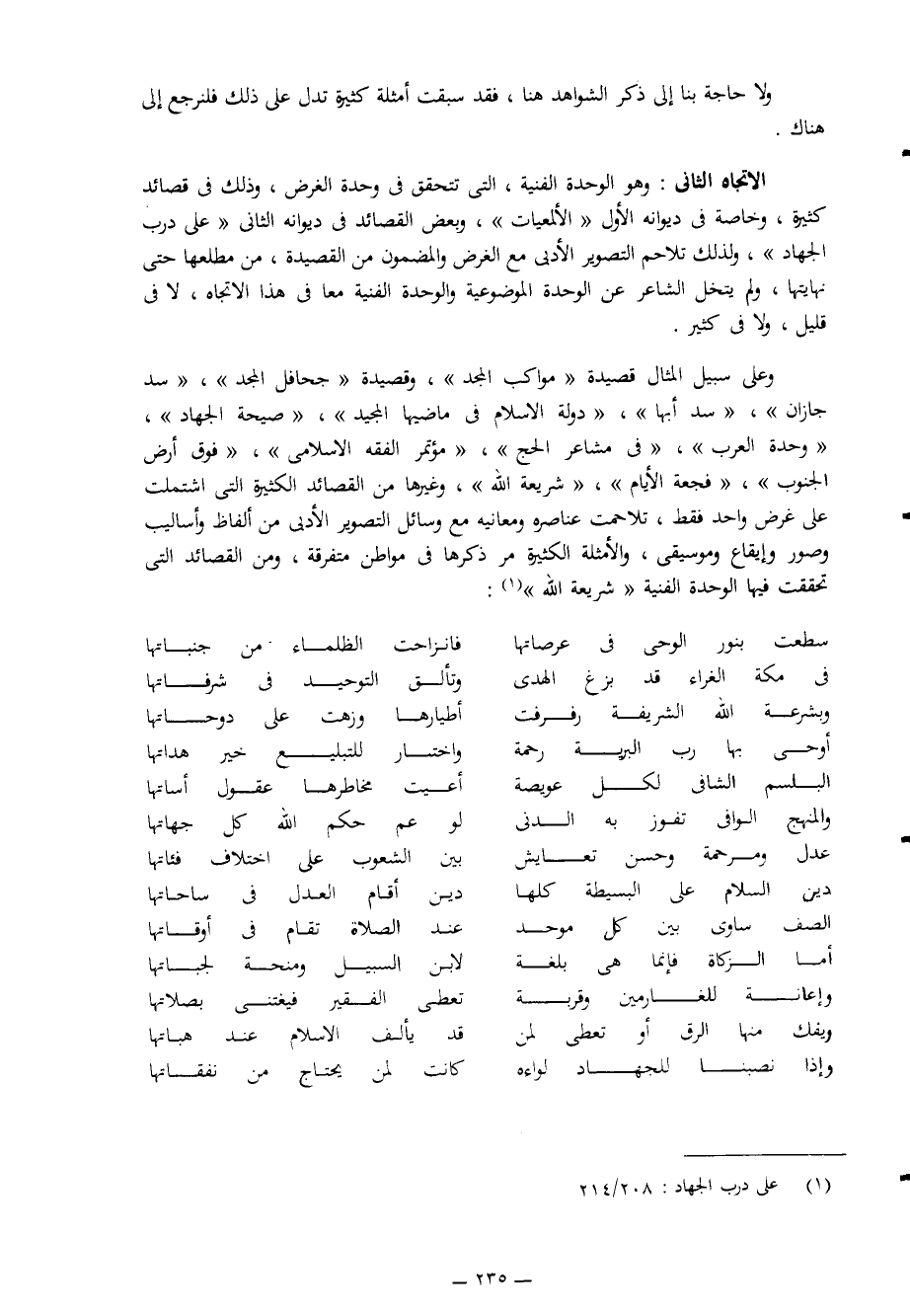 الاتجاه الثاني: وهو الوحدة الفنية التي تتحقق في وحدة الغرض، وذلك في قصائد كثيرة، وخاصَّة في ديوانه الأول "الألمعيات"، وبعض القصائد في ديوانه الثاني "على درب الجهاد"، ولذلك تلاحم التصوير الأدبي مع الغرض والمضمون من القصيدة، من مطلعها حتى نهايتها، ولم يتخل الشاعر عن الوحدة الموضوعية والوحدة الفنية معها في هذا الاتجاه، لا في قليل، ولا في كثير.