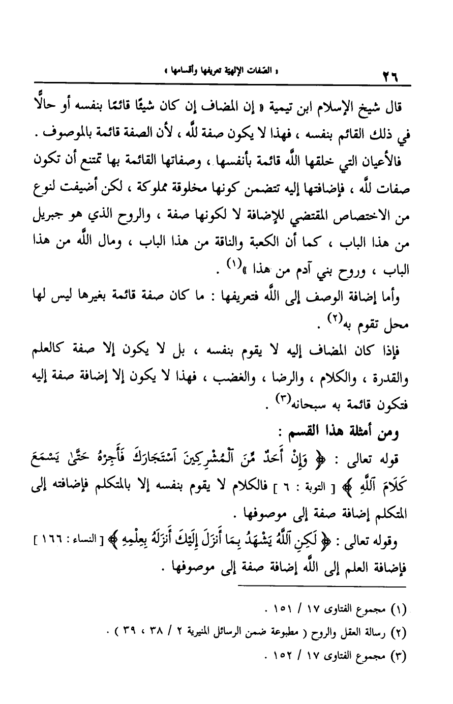 فإذا كان المضاف إليه لا يقوم بنفسه، بل لا يكون إلا صفة كالعلم، والقدرة، والكلام، والرضا، والغضب، فهذا لا يكون إلا إضافة صفة إليه فتكون قائمة به سبحانه3.