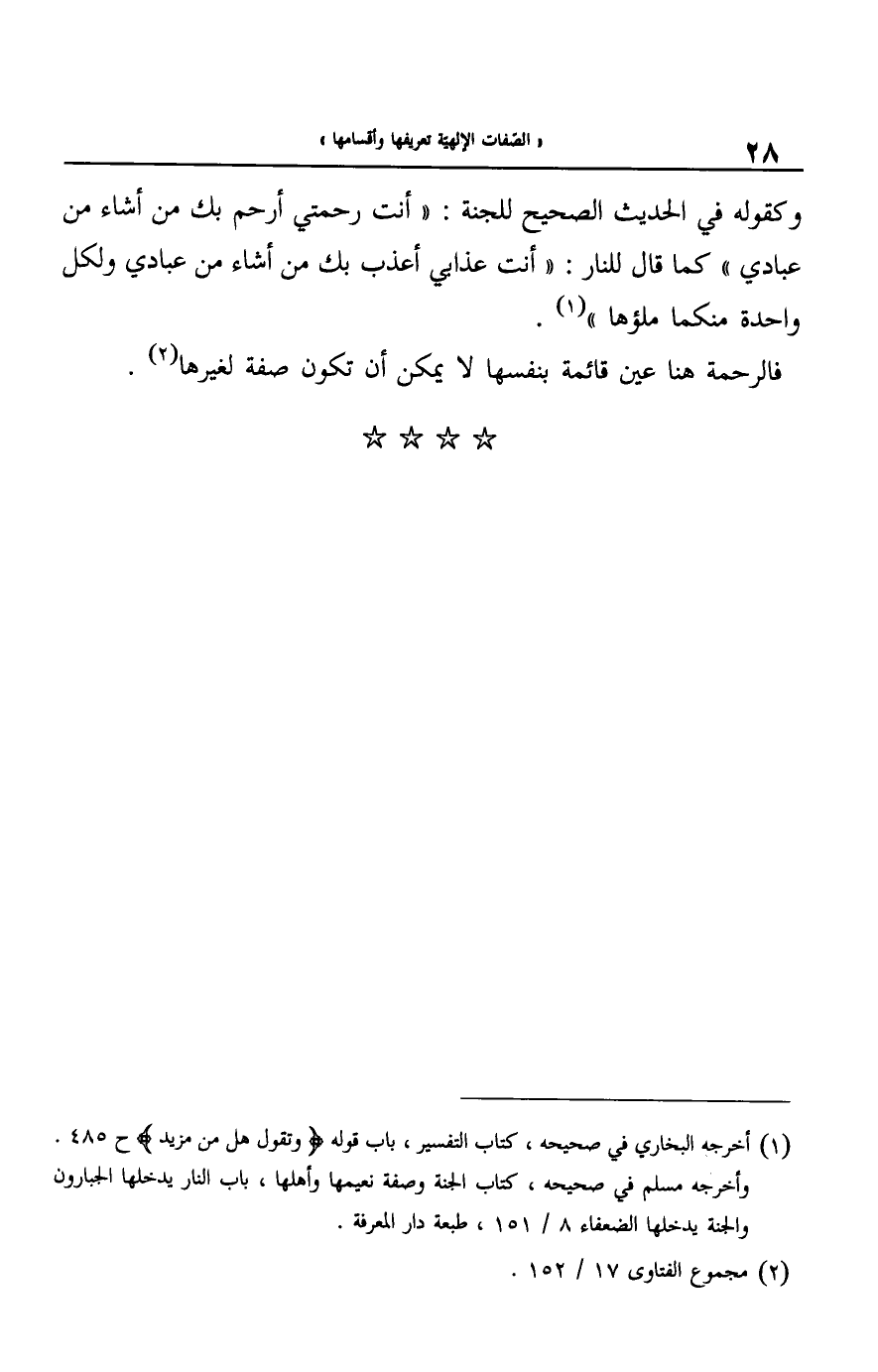 وكقوله في الحديث الصحيح للجنة: "أنت رحمتي أرحم بك من أشاء من عبادي" كما قال للنار: "أنت عذابي أعذب بك من أشاء من عبادي ولكل واحدة منكما ملؤها"1.