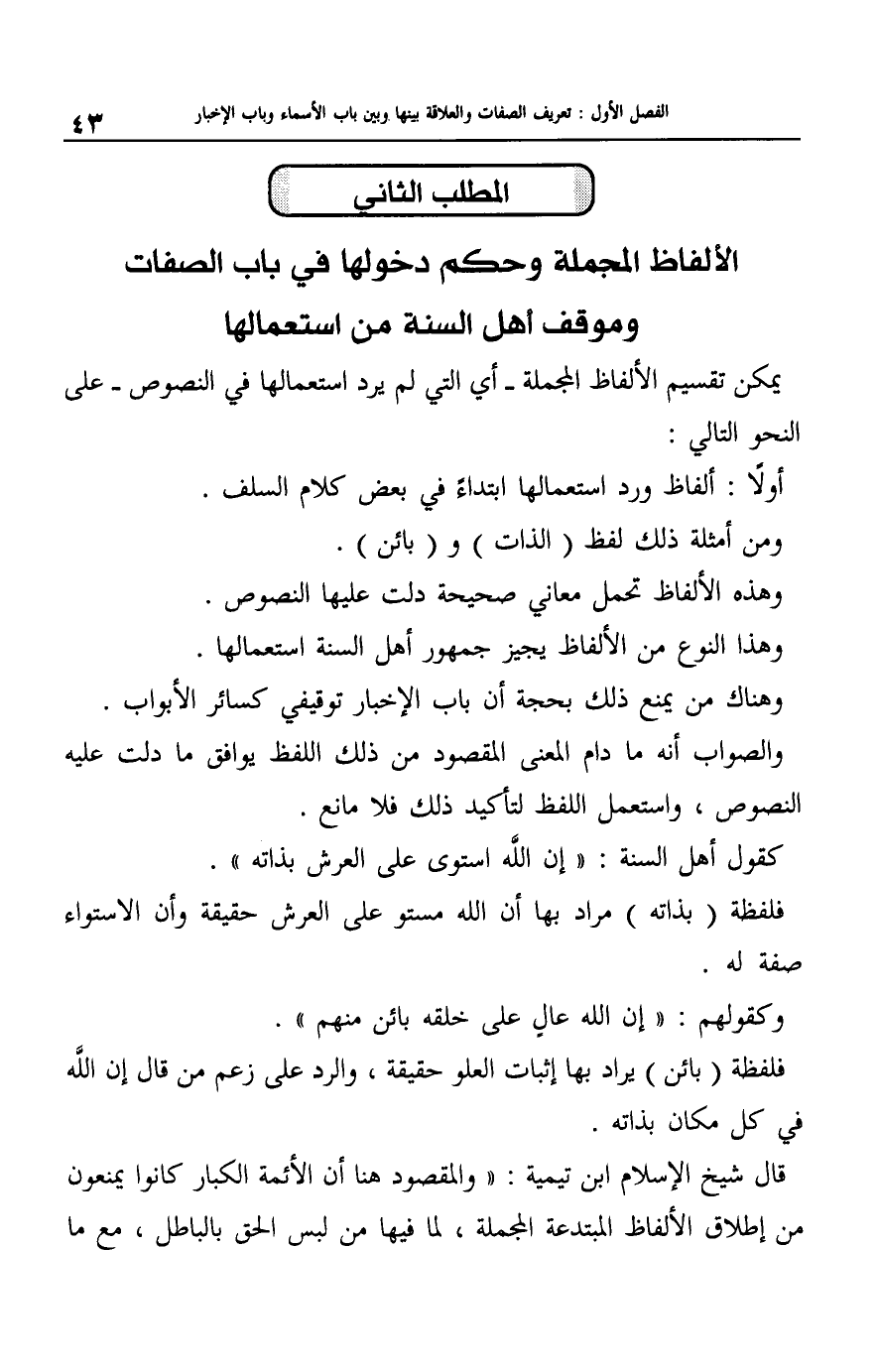 المطلب الثاني: الألفاظ المجملة وحكم دخولها في باب الصفات وموقف أهل السنة من استعمالها.