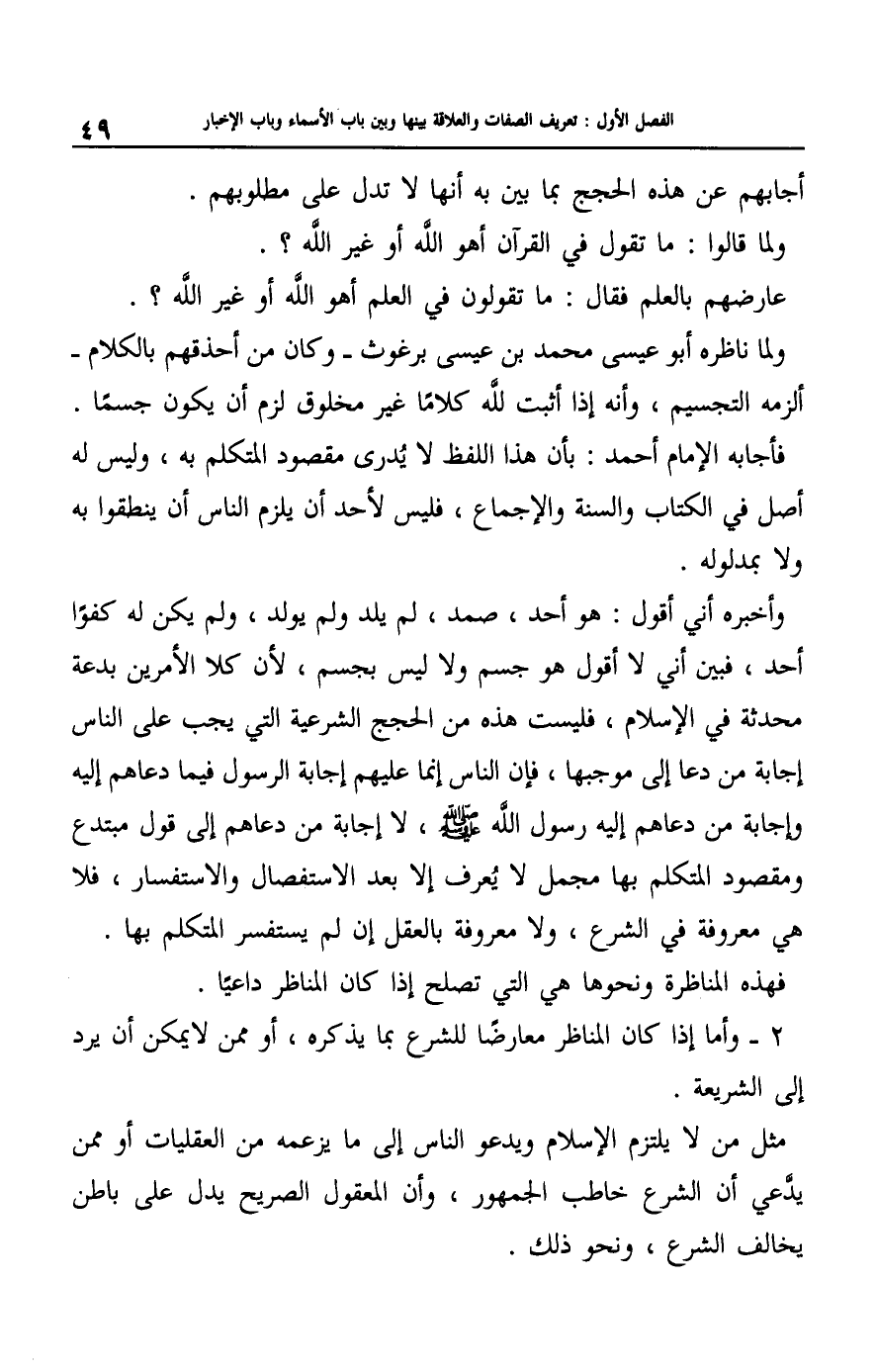 وأخبره أني أقول: هو أحد، صمد، لم يلد ولم يلد، ولم يكن له كفواً أحد، فبين أني لا أقول هو جسم ولا ليس بجسم، لأن كلا الأمرين بدعة محدثة في الإسلام، فليست هذه من الحجج الشرعية التي يجب على الناس إجابة من دعا إلى موجبها، فإن الناس إنما عليهم إجابة الرسول فيما دعاهم إليه وإجابة من دعاهم إليه رسول الله صلى الله عليه وسلم، لا إجابة من دعاهم إلى قول مبتدع، ومقصود المتكلم بها مجمل لا يُعرف إلا بعد الاستفصال والاستفسار، فلا هي معروفة في الشرع، ولا معروفة بالعقل إن لم يستفسر المتكلم بها.