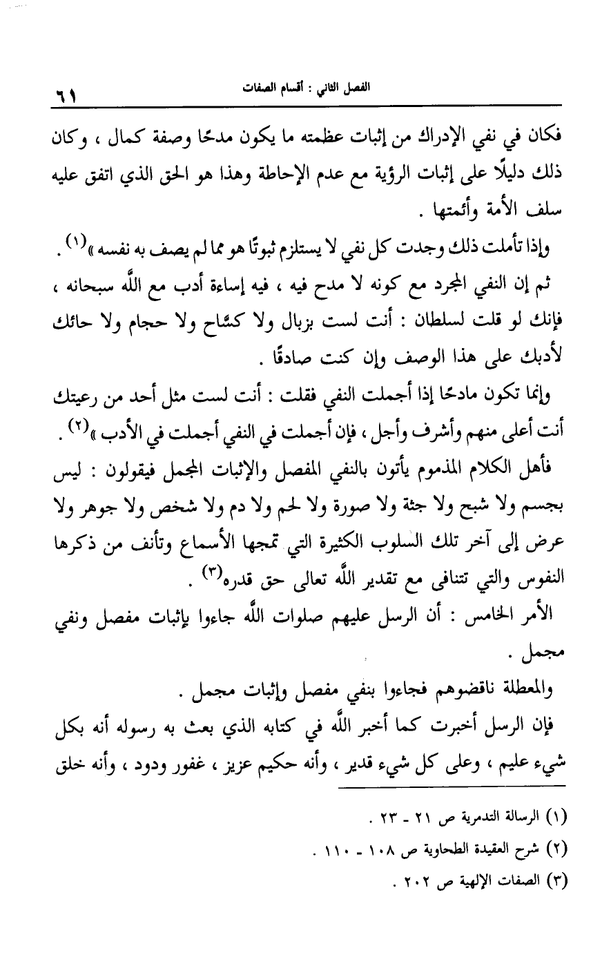 فأهل الكلام المذموم يأتون بالنفي المفصل والإثبات المجمل فيقولون: ليس بجسم ولا شبح ولا جثة ولا صورة ولا لحم ولا دم ولا شخص ولا جوهر ولا عرض إلى آخر تلك السلوب الكثيرة التي تمجها الأسماع وتأنف من ذكرها النفوس والتي تتنافى مع تقدير الله تعالى حق قدره3.