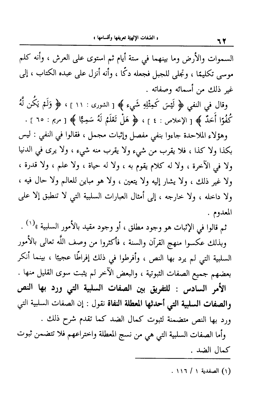 الأمر السادس: للتفريق بين الصفات السلبية التي ورد بها النص والصفات السلبية التي أحدثها المعطلة النفاة نقول: إن الصفات السلبية التي ورد بها النص متضمنة لثبوت كمال الضد كما تقدم شرح ذلك.
