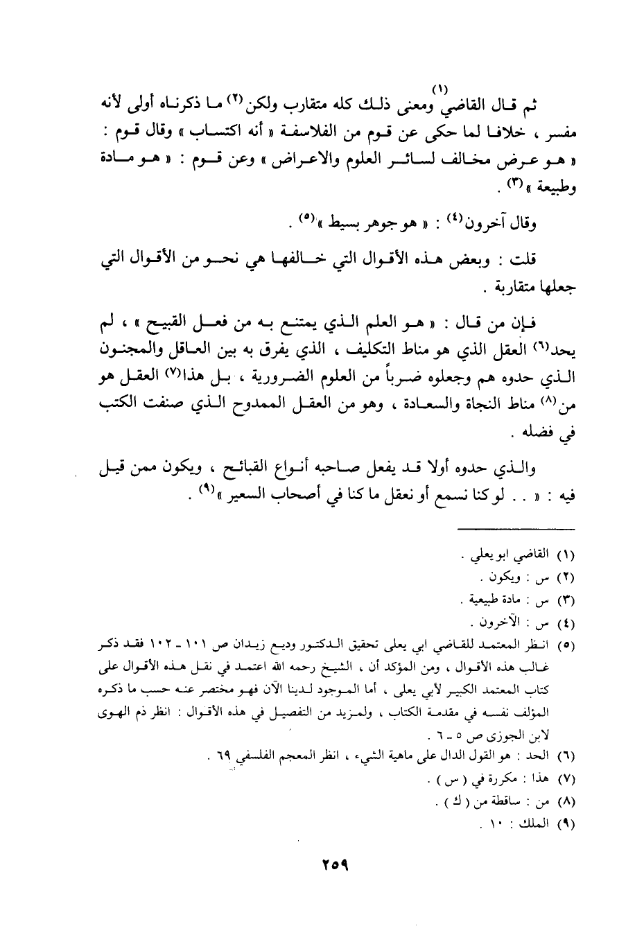 ثم قال القاضي: "ومعنى ذلك كله متقارب ولكن ما ذكرناه أولى لأنه مفسر خلافا لما حكي عن قوم من الفلاسفة أنه اكتساب وقال قوم: "هو عرض مخالف لسائر العلوم والأعراض" وعن قوم "هو مادة وطبيعة".
