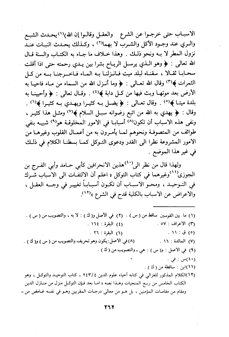 ولهذا قال من نظر إلى هذين الانحرافين كأبي حامد وأبي الفرج بن الجوزي وغيرهما في كتاب التوكل "إعلم أن الالتفات إلى الأسباب شرك في التوحيد ومحو الأسباب أن تكون أسبابا تغيير في وجه العقل والإعراض عن الأسباب بالكلية قدح في الشرع".