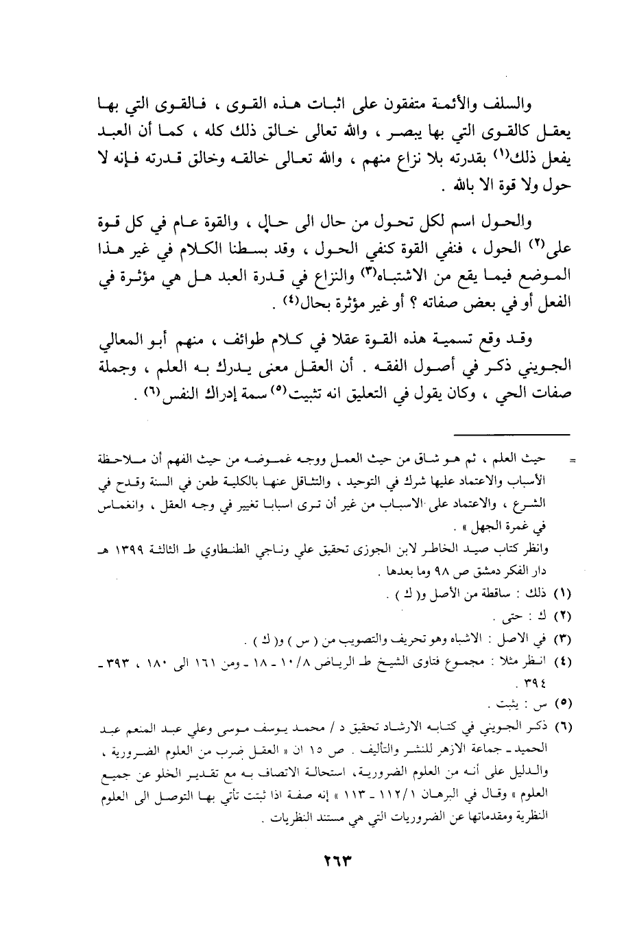 والسلف والأئمة متفقون على إثبات هذه القوى فالقوى التي بها يعقل كالقوي التي بها يبصر والله تعالى خالق ذلك كله كما أن العبد يفعل ذلك بقدرته بلا نزاع منهم والله تعالى خالقه وخالق قدرته فإنه لا حول ولا قوة إلا بالله.