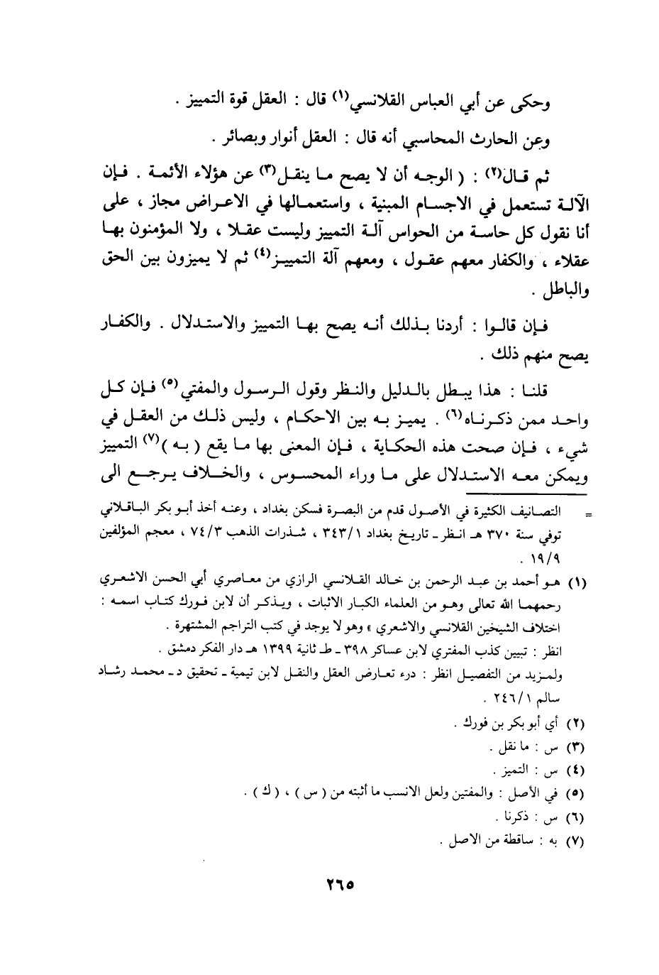 ثم قال: "الوجه أن لا يصح ما ينقل عن هؤلاء الآئمة فإن الآلة تستعمل في الأجسام المبنية واستعمالها في الأعراض مجاز على أنا نقول كل حاسة من الحواس آلة التمييز وليس عقلا ولا المؤمنون بها عقلاء والكفار معهم عقول ومعهم آلة التمييز ثم لا يميزون بين الحق والباطل.