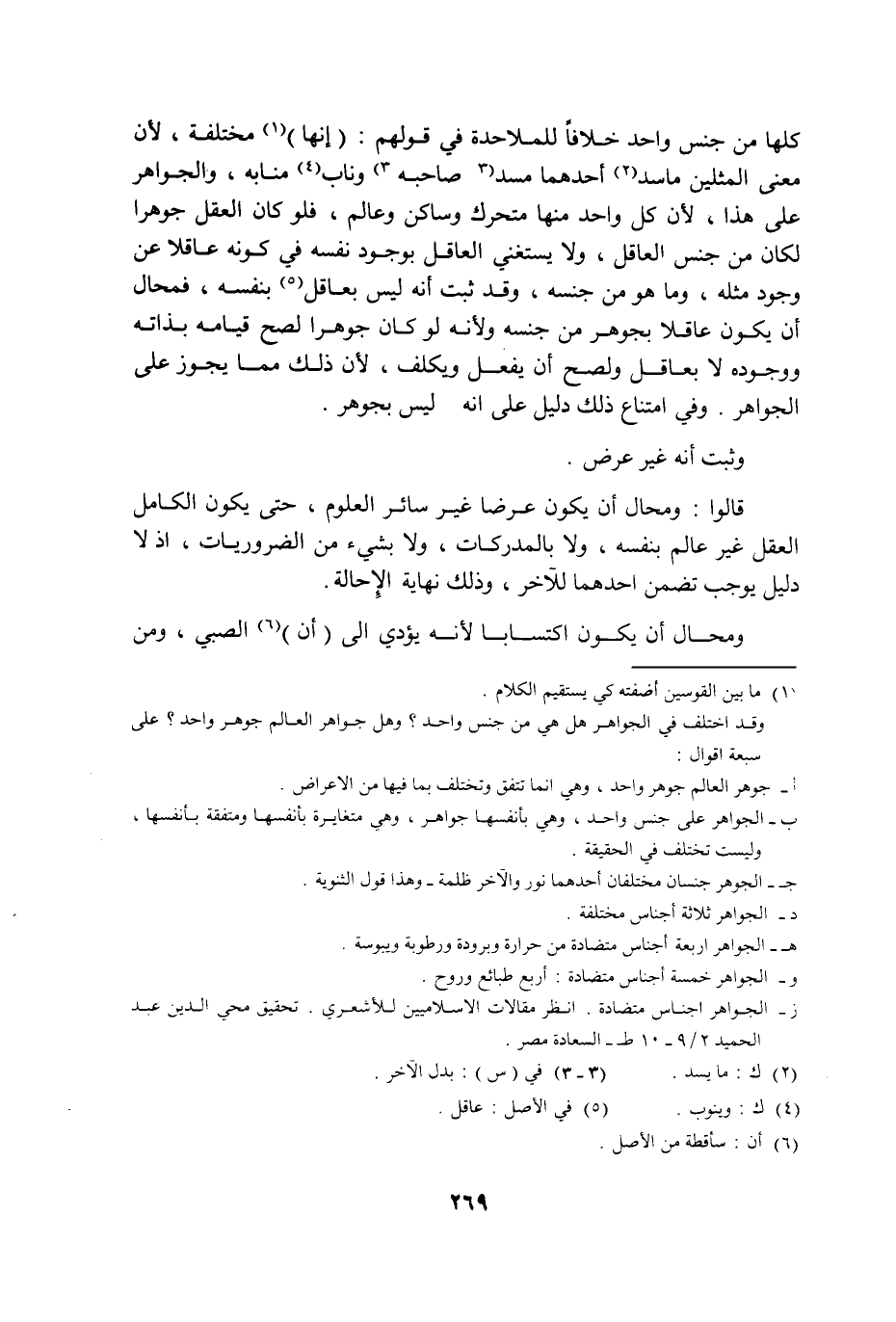 كلها من جنس واحد خلافا للملاحدة في قولهم إنها مختلفة لأن معنى المثلين فاسد أحدهما مسد صاحبه وناب منابه والجواهر على هذا لأن كل واحد منها متحرك وساكن وعالم فلو كان العقل جوهرا لكان من جنس العاقل ولا يستغني العاقل بوجود نفسه في كونه عاقلا عن وجود مثله وما هو من جنسه وقد ثبت أنه ليس بعاقل بنفسه فمحال أن يكون عاقلا بجوهر من جنسه ولأنه لو كان جوهرا لصح قيامه بذاته ووجوده لا بعاقل ولصح أن يفعل ويكلف لأن ذلك مما يجوز على الجواهر وفي امتناع ذلك دليل على أنه ليس بجوهر.