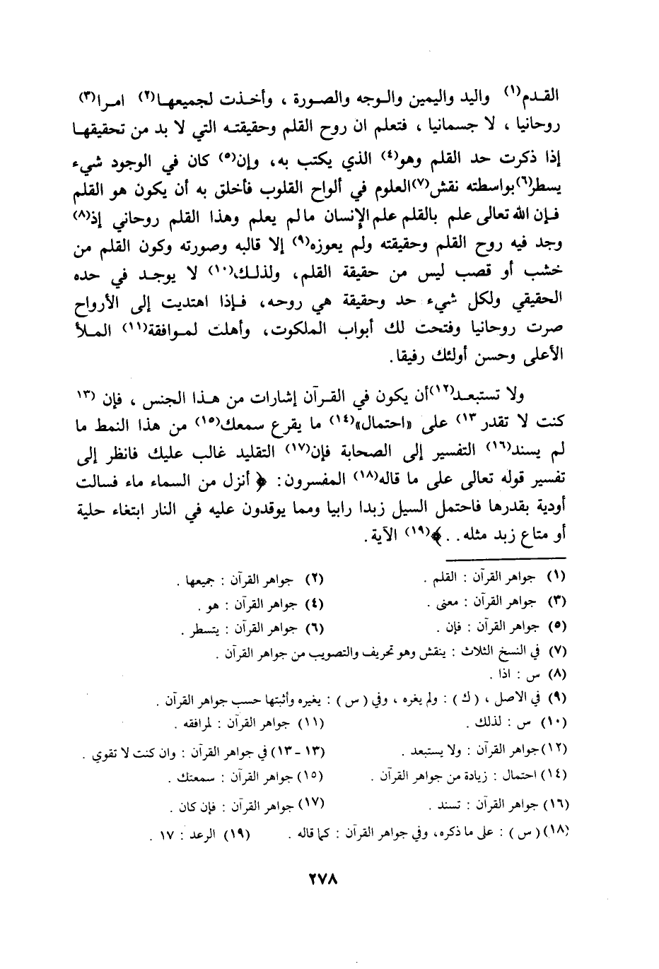 القدم واليد واليمين والوجه والصورة وأخذت لجميعها أمرا روحانيا لا جسمانيا فتعلم أن روح القلم وحقيقته التي لا بد من تحقيقها إذا ذكرت حد القلم وهو الذي يكتب به وإن كان في الوجود شيء يسطر بواسطته نقش العلوم في ألواح القلوب فأخلق به أن يكون هو القلم فإن الله تعالى علم بالقلم علم الإنسان ما لم يعلم وهذا القلم روحاني إذ وجد فيه روح القلم وحقيقته ولم يعوزه إلا قالبه وصورته وكون القلم من خشب أو قصب ليس من حقيقة القلم ولذلك لا يوجد في حده الحقيقي ولكل شيء حد وحقيقة هي روحه فإذا اهتديت إلى الأرواح صرت روحانيا وفتحت لك أبواب الملكوت وأهلت لموافقة الملأ الأعلى وحسن أولئك رفيقا.