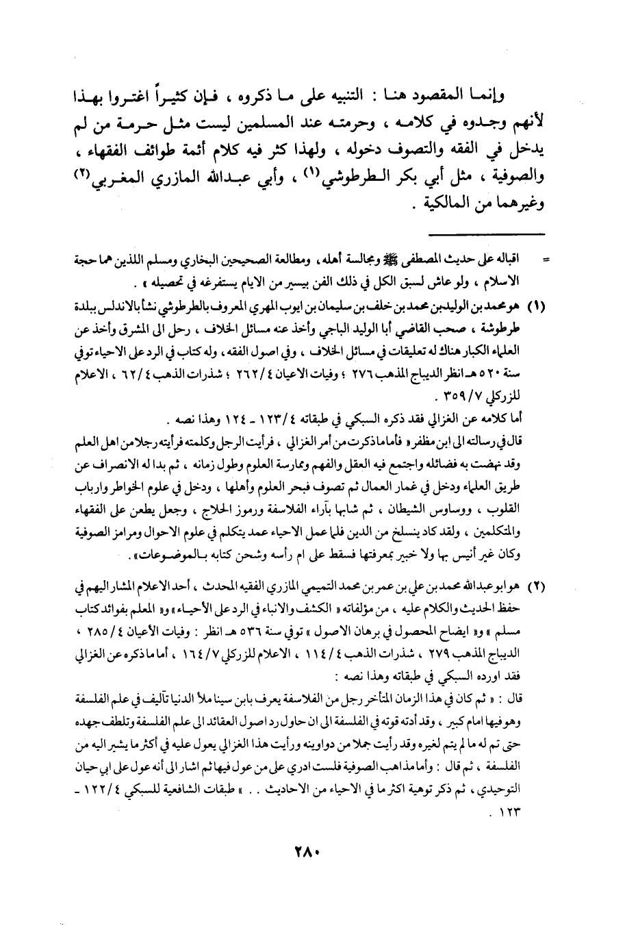 وإنما المقصود هنا التنبيه على ما ذكروه فإن كثيرا اغتروا بهذا لأنهم وجدوه في كلامه وحرمته عند المسلمين ليست مثل حرمة من لم يدخل في الفقه والتصوف دخوله ولهذا كثر فيه كلام أئمة طوائف الفقهاء والصوفية مثل أبي بكر الطرطوشي وأبي عبد الله المازري المغربي وغيرهما من المالكية.