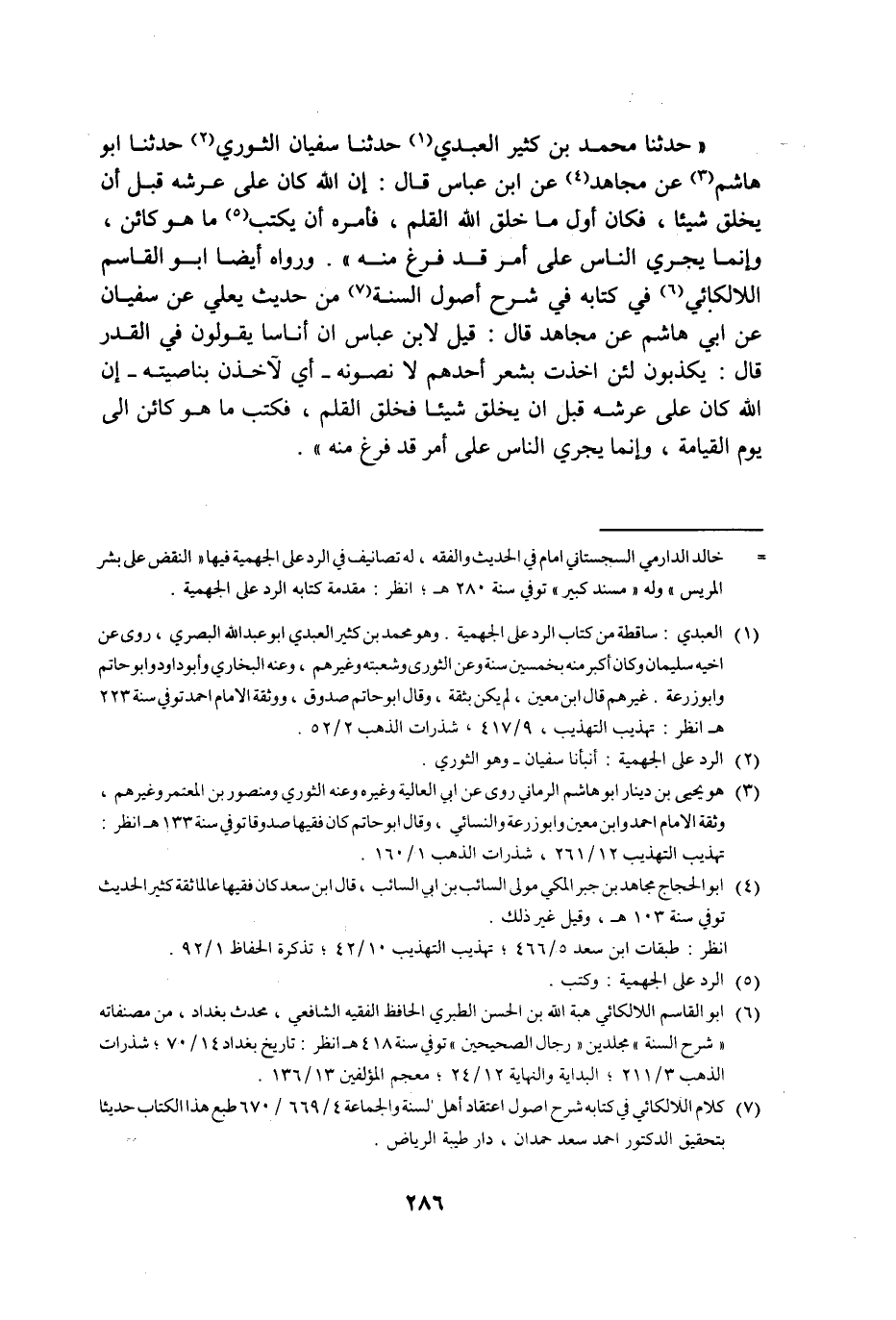 حدثنا محمد بن كثير العبدي حدثنا سفيان الثوري حدثنا أبو هاشم عن مجاهد عن ابن عباس قال: "إن الله كان على عرشه قبل أن يخلق شيئا فكان أول ما خلق الله القلم فأمره أن يكتب ما هو كائن وإنما يجري الناس على أمر قد فرغ منه" ورواه أيضا أبو القاسم اللالكائي في كتابه في شرح أصول السنة من حديث يعلى عن سفيان عن أبي هاشم عن مجاهد قال قيل لابن عباس: إن أناسا يقولون في القدر؟ قال: "يكذبون لئن أخذت بشعر أحدهم لا نصونه أي لآخذن بناصيته إن الله كان على عرشه قبل أن يخلق شيئا فخلق القلم فكتب ما هو كائن إلى يوم القيامة وإنما يجري الناس على أمر قد فرغ منه".