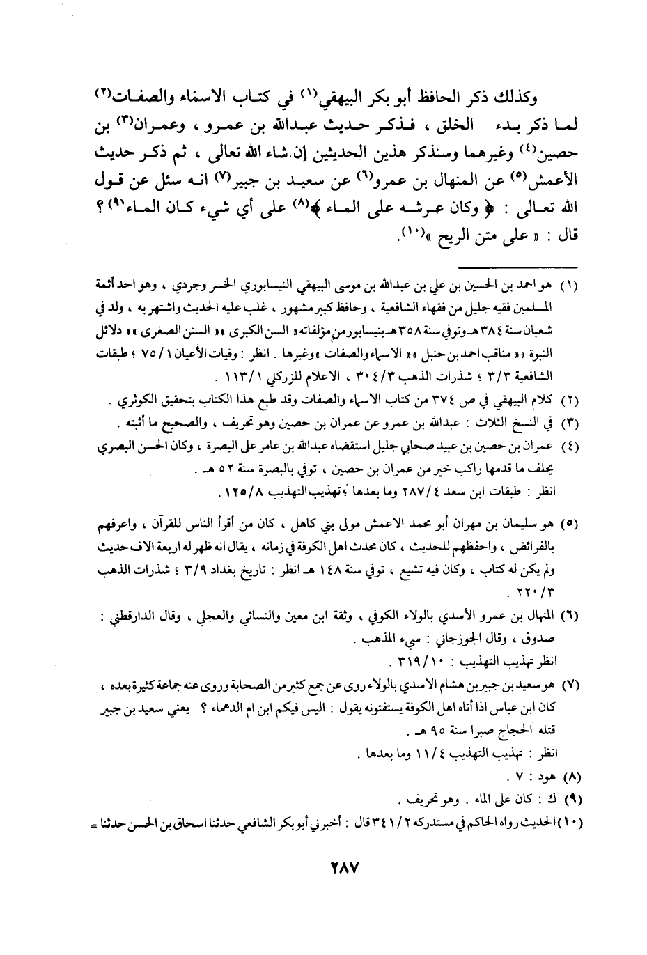 وكذلك ذكر الحافظ أبو بكر البيهقي في كتاب الأسماء والصفات لما ذكر بدء الخلق فذكر حديث عبد الله بن عمرو وعمران بن حصين وغيرهما وسنذكر هذين الحديثين إن شاء الله تعالى ثم ذكر حديث الأعمش عن المنهال بن عمرو عن سعيد بن جبير أنه سئل عن قوله تعالى: {وَكَانَ عَرْشُهُ عَلَى الْمَاءِ} على أي شيء كان الماء؟ قال: "على متن الريح".
