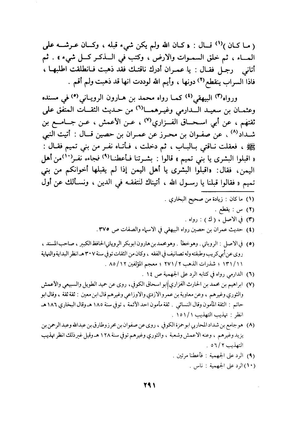 ورواه البيهقي كما رواه محمد بن هارون الروياني في مسنده وعثمان بن سعيد الدارمي وغيرهما من حديث الثقات المتفق على ثقتهم عن أبي إسحاق الفزاري عن الأعمش عن جامع بن شداد عن صفوان بن محرز عن عمران بن حصين قال: أتيت النبي صلى الله عليه وسلم فعقلت ناقتي بالباب ثم دخلت فأتاه نفر من بني تميم فقال: "اقبلوا البشرى يا بني تميم" قالوا: بشرتنا فأعطنا فجاءه نفر من أهل اليمن فقال: "اقبلوا البشرى يا أهل اليمن إذا لم يقبلها إخوانكم من بني تميم" فقالوا: قبلنا يا رسول الله أتيناك لنتفقه في الدين ونسألك عن أول